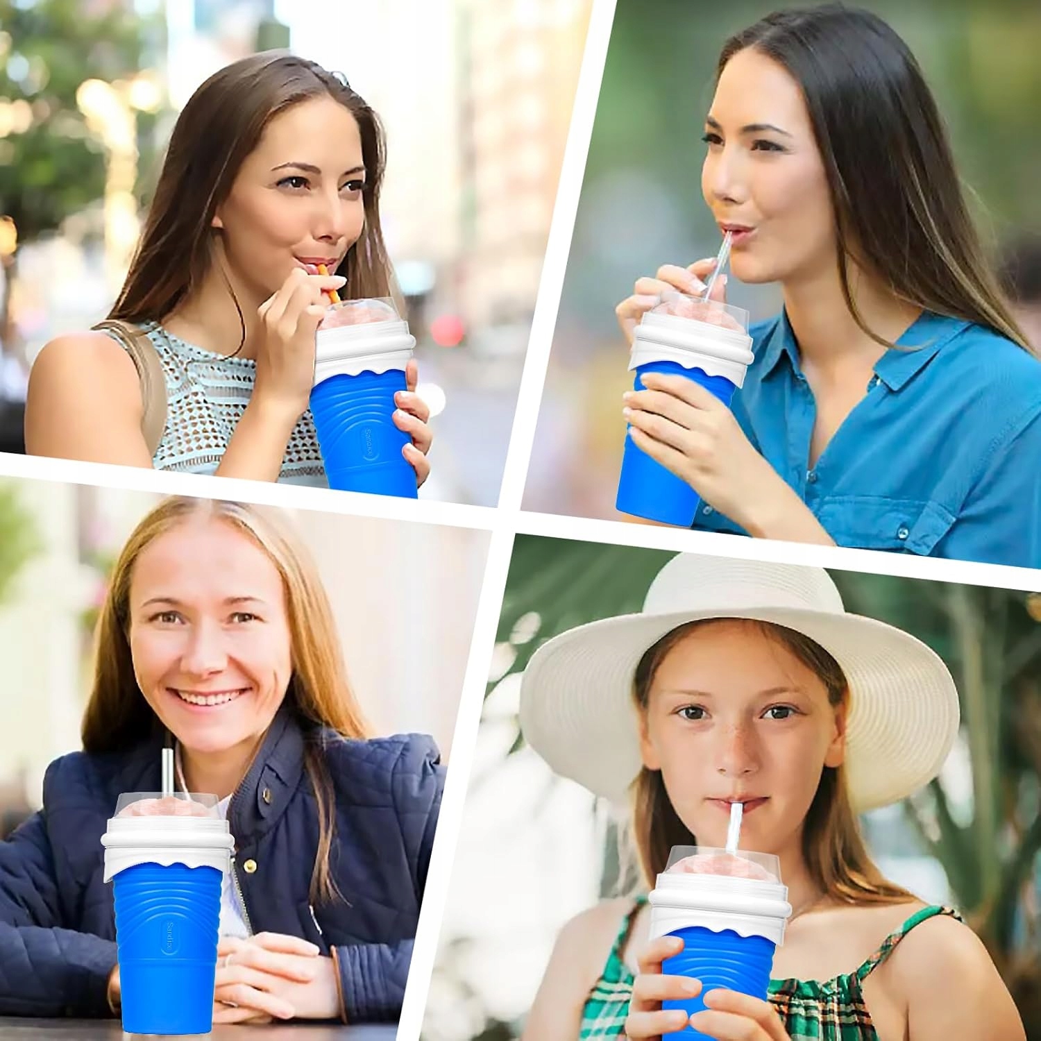 🍦【 Slushy's Вироблення комплекту містить 】 - 1 пристрій виготовлення сльота, 1 столова ложка 2 в 1, 1 склянку пензля, 1 солом’яна щітка. Ложку, прикріплену до чашки коктейлів, можна прикріпити до соломи або використовувати безпосередньо для виготовлення коктейлів. 4 Використання】 - 1. Заморожуйте чашку близько 3-6 годин, поки вона не замерзне (чашка стає важкою). Тим часом поставте в холодильник потрібний напій, сік або лимонад. 2. Зніміть пристрій для виготовлення Slusha з холодильника. Вилийте улюблений напій і закрийте кришку. 3. Просто стисніть чашки на 1-3 хвилини. Час від часу змішайте обережно, щоб отримати улюблений коктейль.