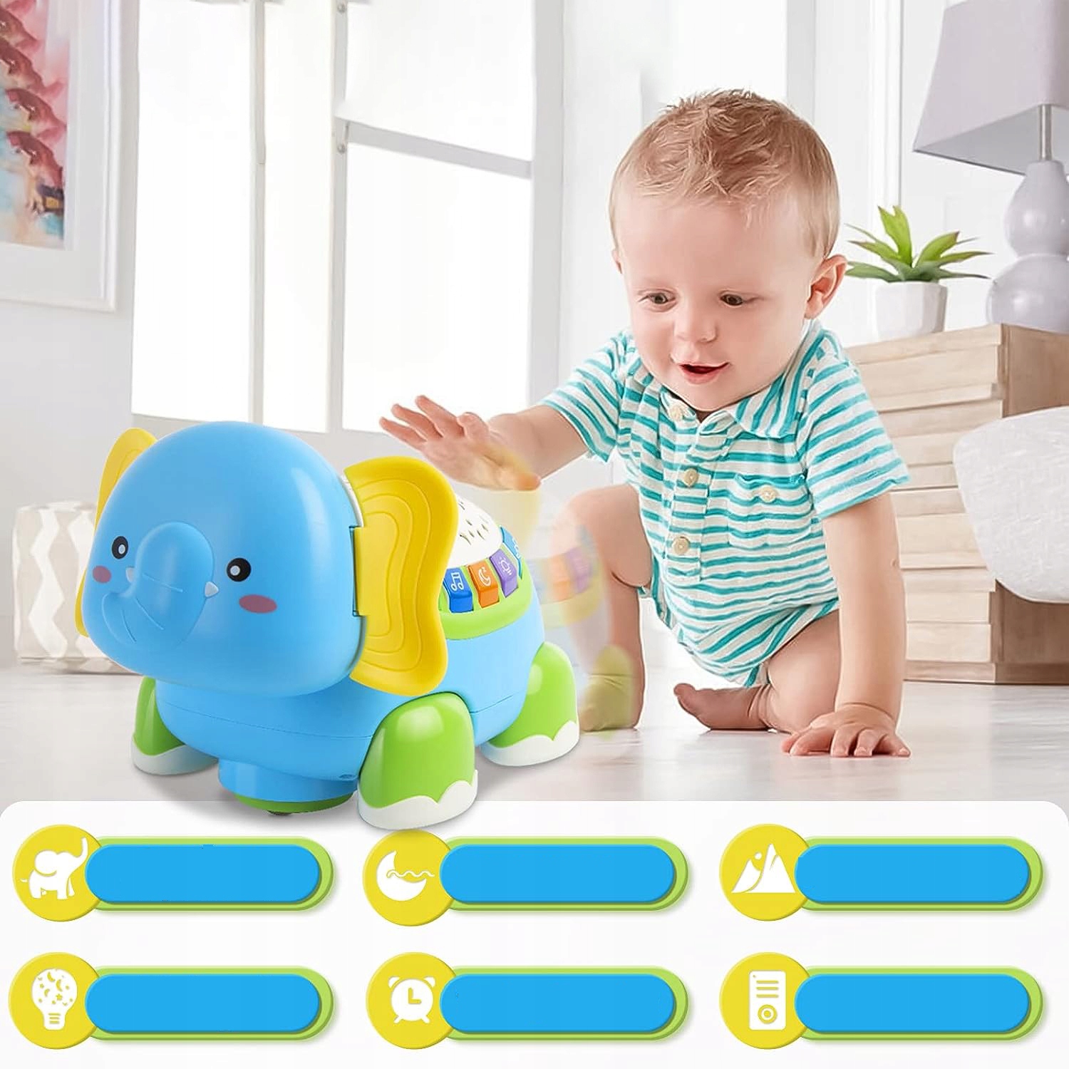 🌟【Заохочуйте дитину повзати】: Просто натисніть кнопку на спині слона та виберіть режим повзання. Іграшка рухається, клацає вушками, виляє хвостиком і грає пісні! Ви можете безпечно привернути увагу малюка та заохотити його ганятися та повзати.