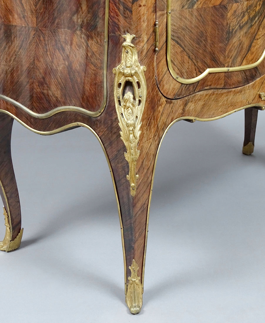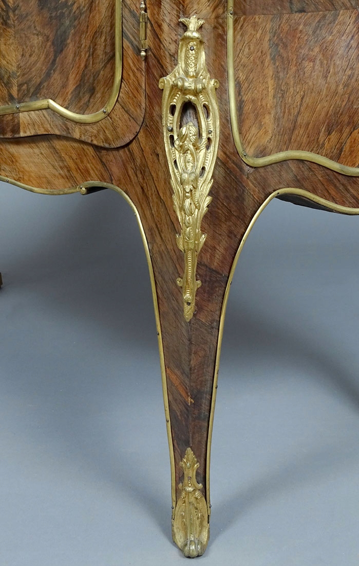 Конструкція з червоного дерева, палісандровий шпон, позолочена бронзова фурнітура, латунні смуги, мармурова верхня частина, приблизно 1900 рік.