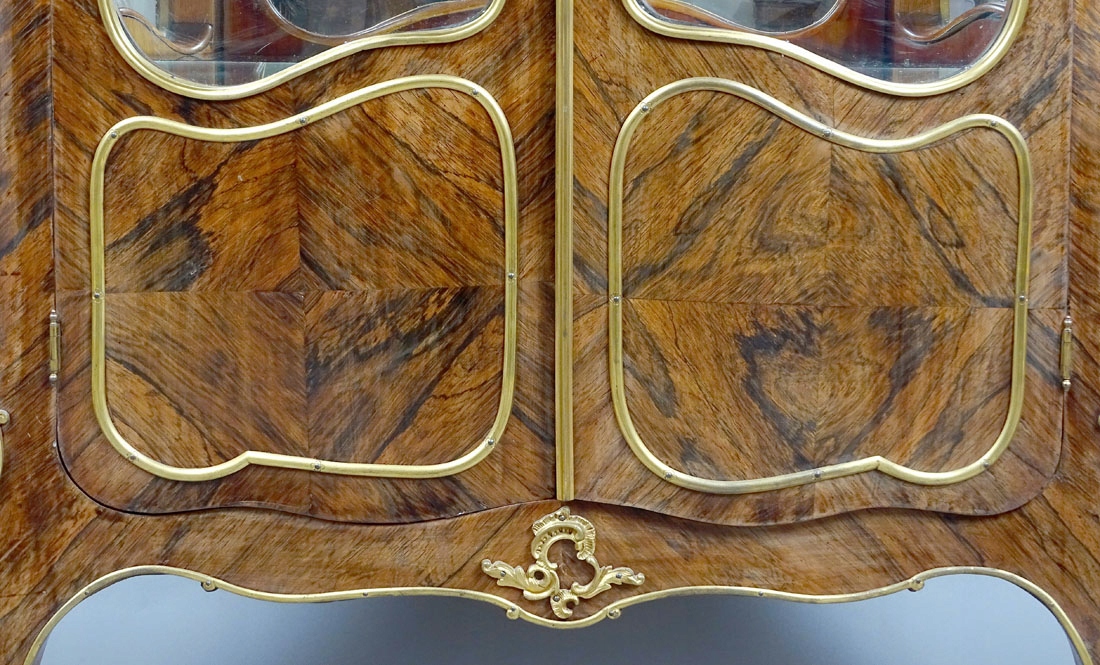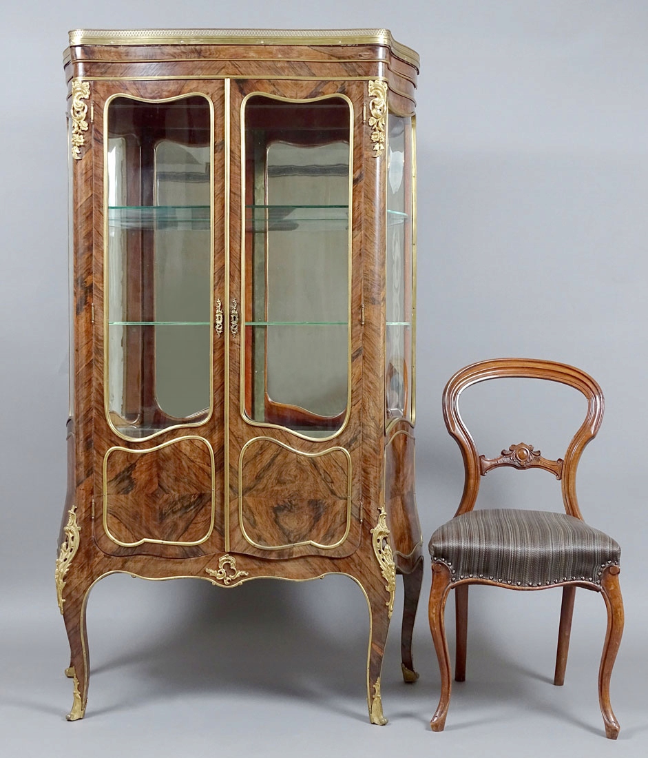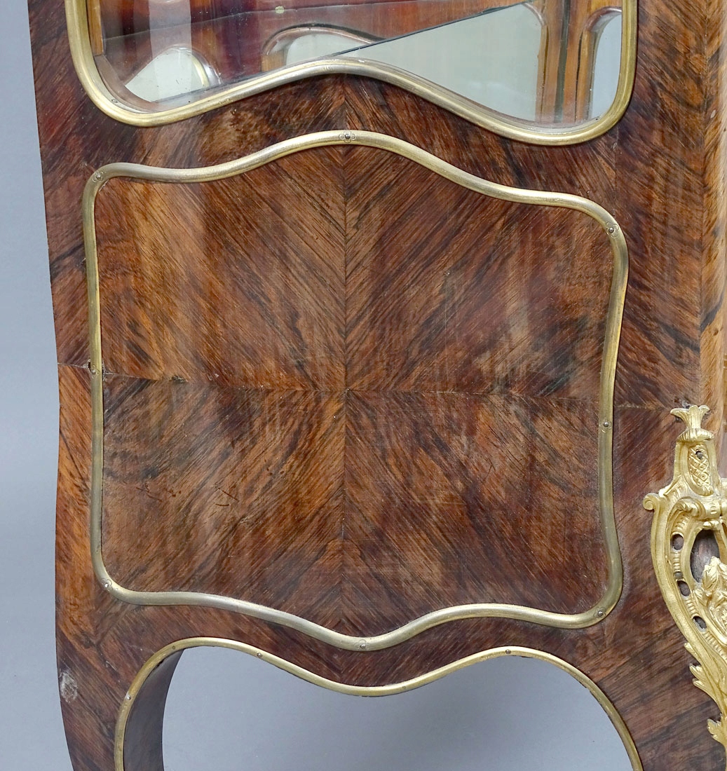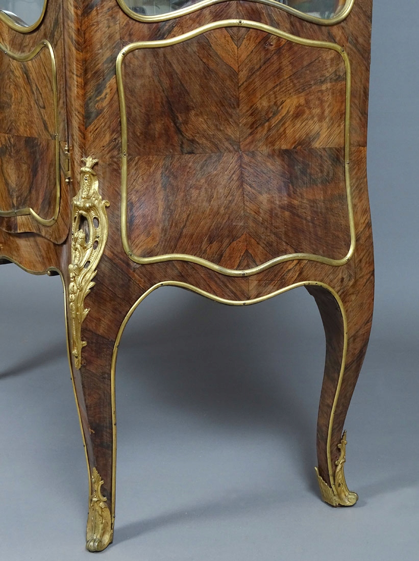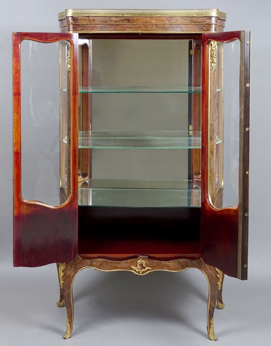 з вигнутою передньою частиною та боками, заскленим з трьох боків, закривається парою дверцят, спирається на чотири ніжки кабріолету, декоровані з бронзою. Дверні полотна з планковим замком і ключем, з резервною панеллю внизу, оздоблені латунною смугою, як і вигнуті вікна вгорі, які також оздоблені смугою. Ідентичні форми прикрас на бічних сторонах шафи. Передні кути заокруглені, зверху та на ніжках прикрашені ажурними аплікаціями з позолоченої бронзи. У верхній частині є оригінальна мармурова стільниця з тонкою галереєю навколо неї. Всередині дві скляні полиці та одна дзеркальна полиця з великим дзеркалом на задній частині.