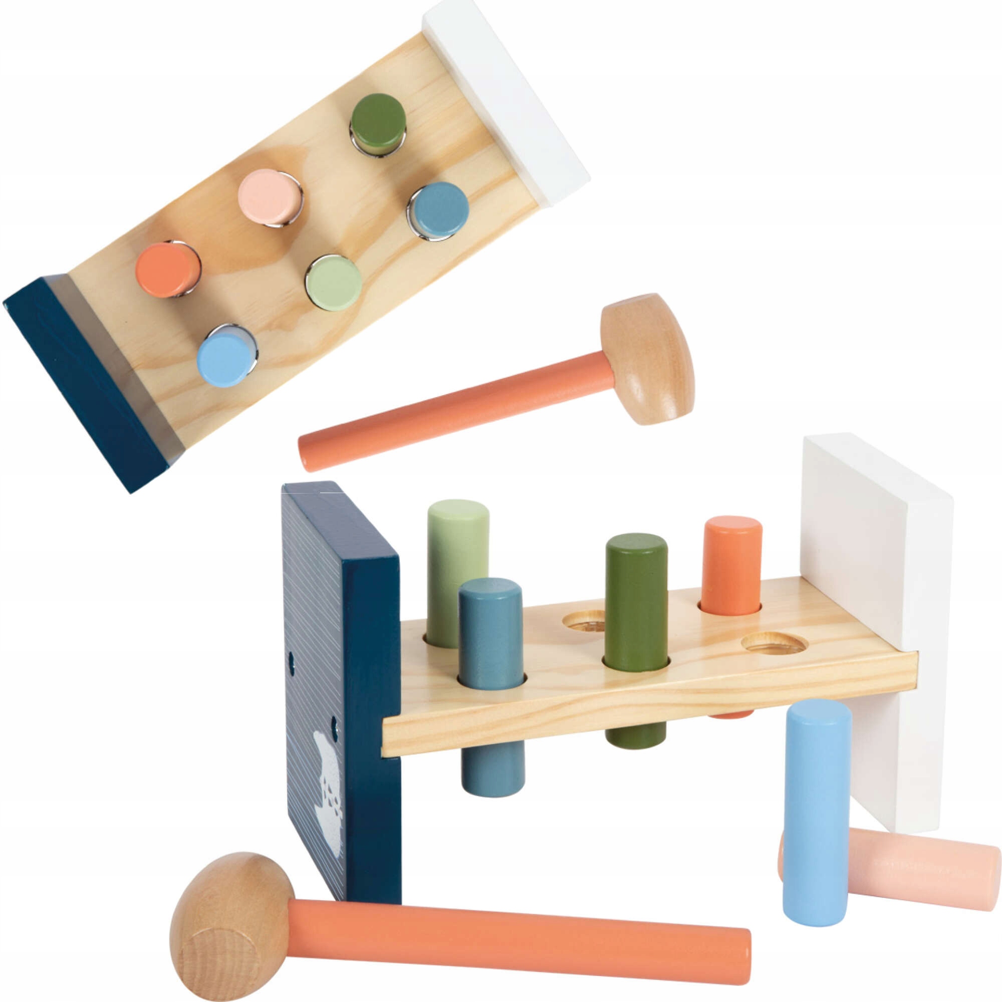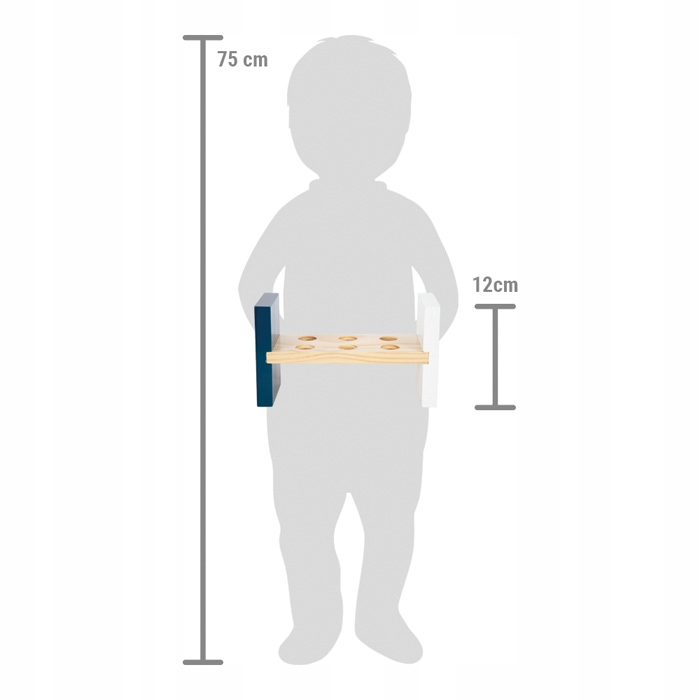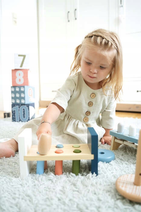 Набір складається з стійкої дошки кольору натурального дерева з кольоровими елементами для прибивання. Іграшка має товсті різнокольорові кілочки для забивання.