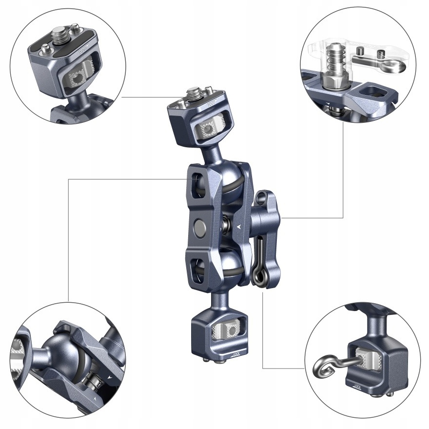 На обох кінцях затиску кульової головки є виїмки, які залишають простір, дозволяючи гнучке регулювання головок кульки і спростити встановлення на них відеоаксесуарів.