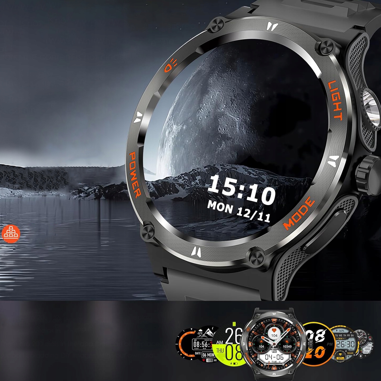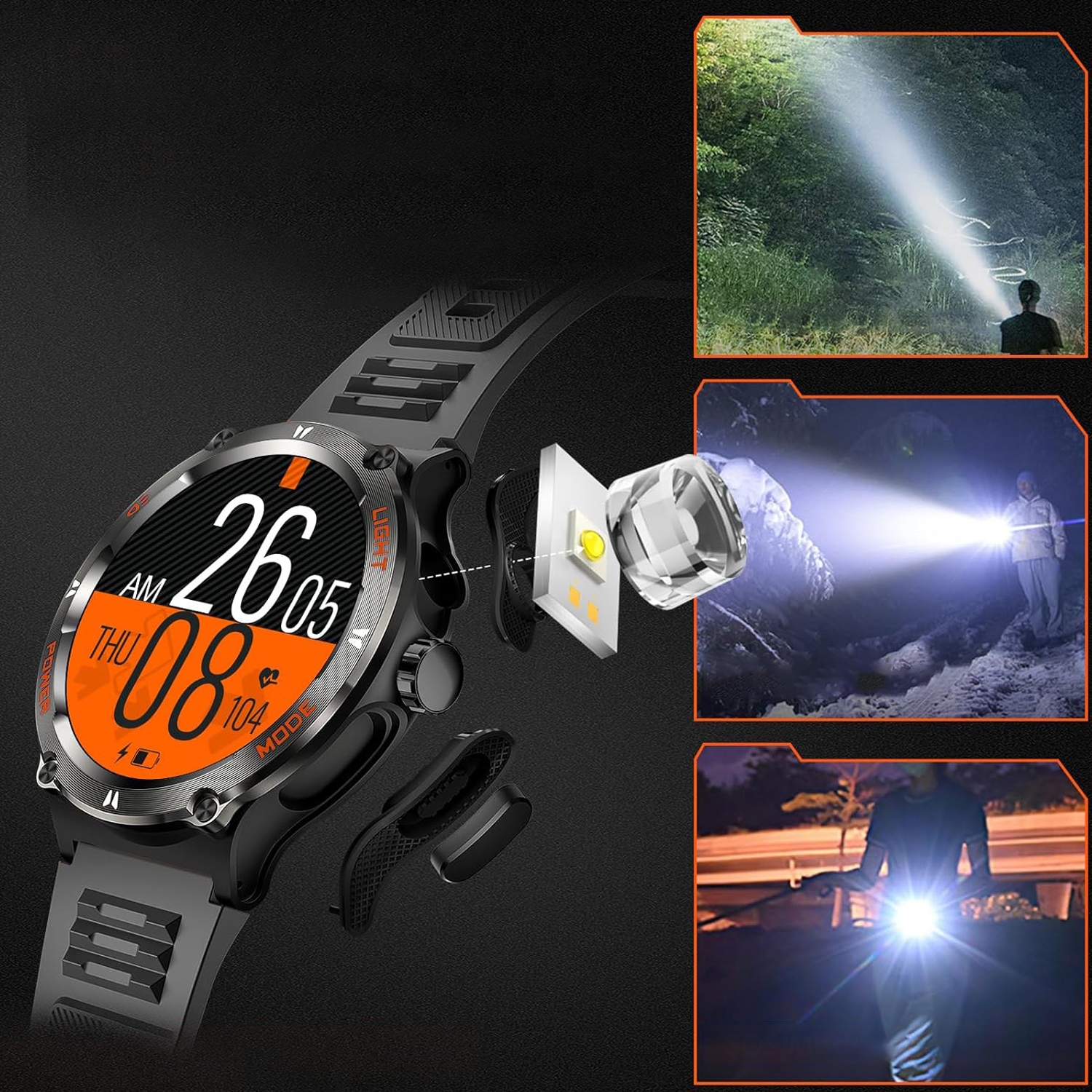 Інтелектуальний чоловічий годинник оснащений світлодіодним ліхтариком, встановленим на стороні, який супроводжуватиме вас у невідомому районах, не боячись темряви (3 режими: строб, соус , спалах лампи, діапазон освітлення до приблизно 5 метрів). У поєднанні з інтелектуальними функціями, такими як компас, світовий годинник, погода, музичний плеєр, таймер, будильник, калькулятор тощо, є ідеальним супутником у свіжій повітряній пригоді.