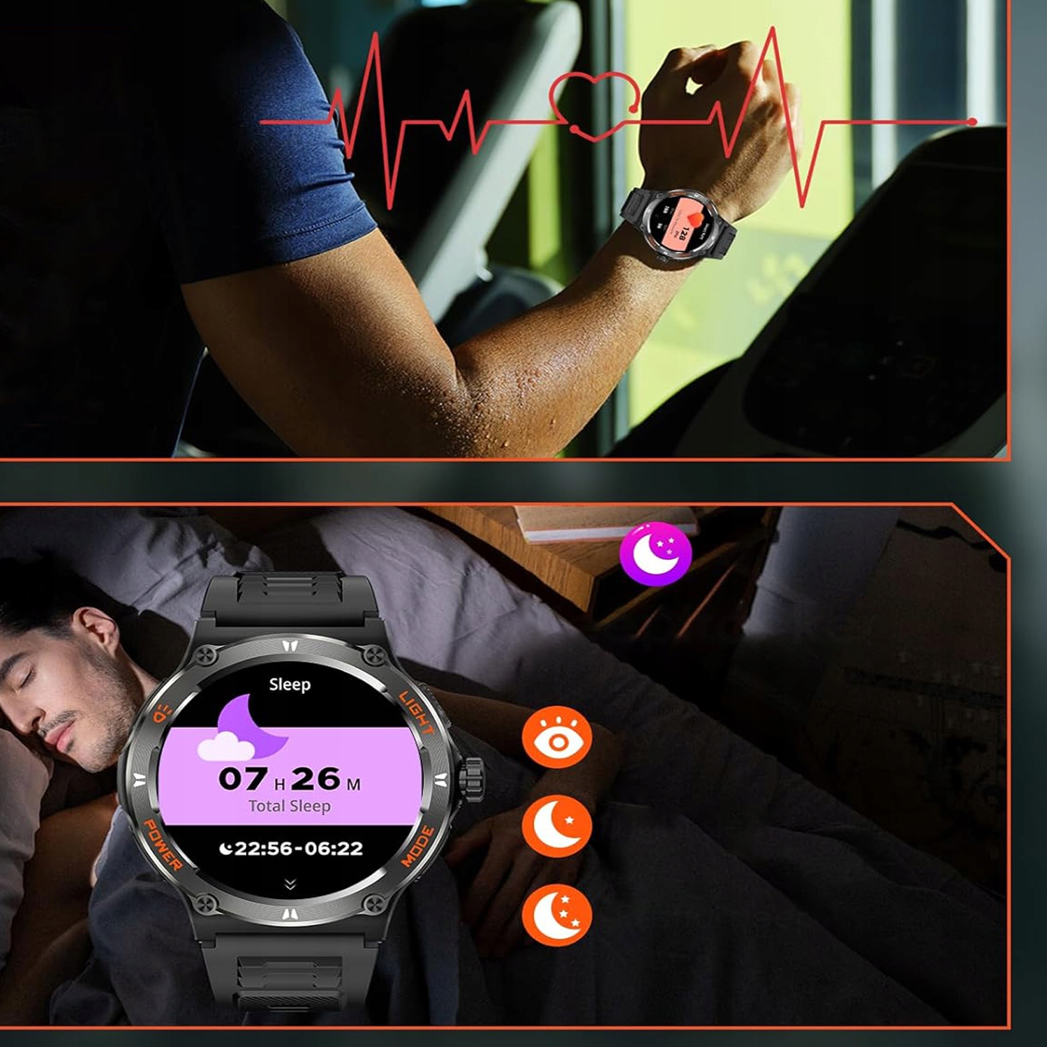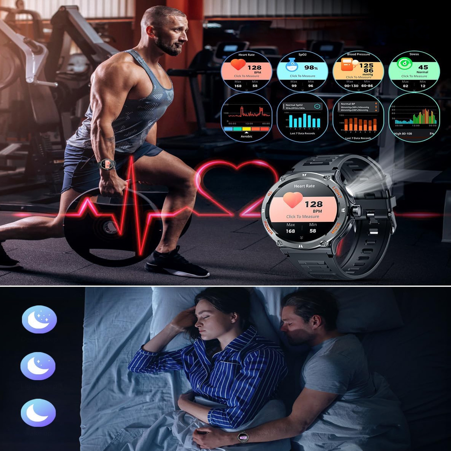 Цей чоловічий спортивний годинник постійно контролює частоту серцевих скорочень 24 години на день, а також може контролювати артеріальний тиск, насичення киснем, стрес і стан сну, щоб всебічно контролювати ваше здоров'я. Цей військовий годинник чоловічої статі також пропонує понад 100 різних режимів вправ, всебічно реєструючи дані про вправи, які допоможуть вам досягти цілей у галузі охорони здоров'я.