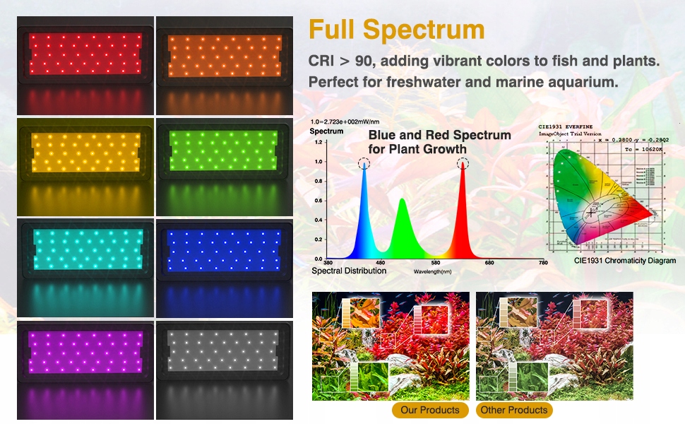 【Оновлений високоякісний світлодіодний ліхтар】 Надяскраві світлодіоди RGB повного спектру з високоякісними кульками для моделі 5054, завдяки чому освітлення вашого акваріума буде на 35% яскравішим, ніж інші. Корпус з алюмінієвого сплаву стильний і надзвичайно міцний, швидке тепловідведення, довгий термін служби. Водонепроникність за стандартом IP68 - вам не потрібно турбуватися про бризки або випадкове падіння у воду. Безпечна конструкція низької напруги, не завдасть шкоди людям або рибі. Він ідеально підходить для прісноводних і морських риб і водних рослин