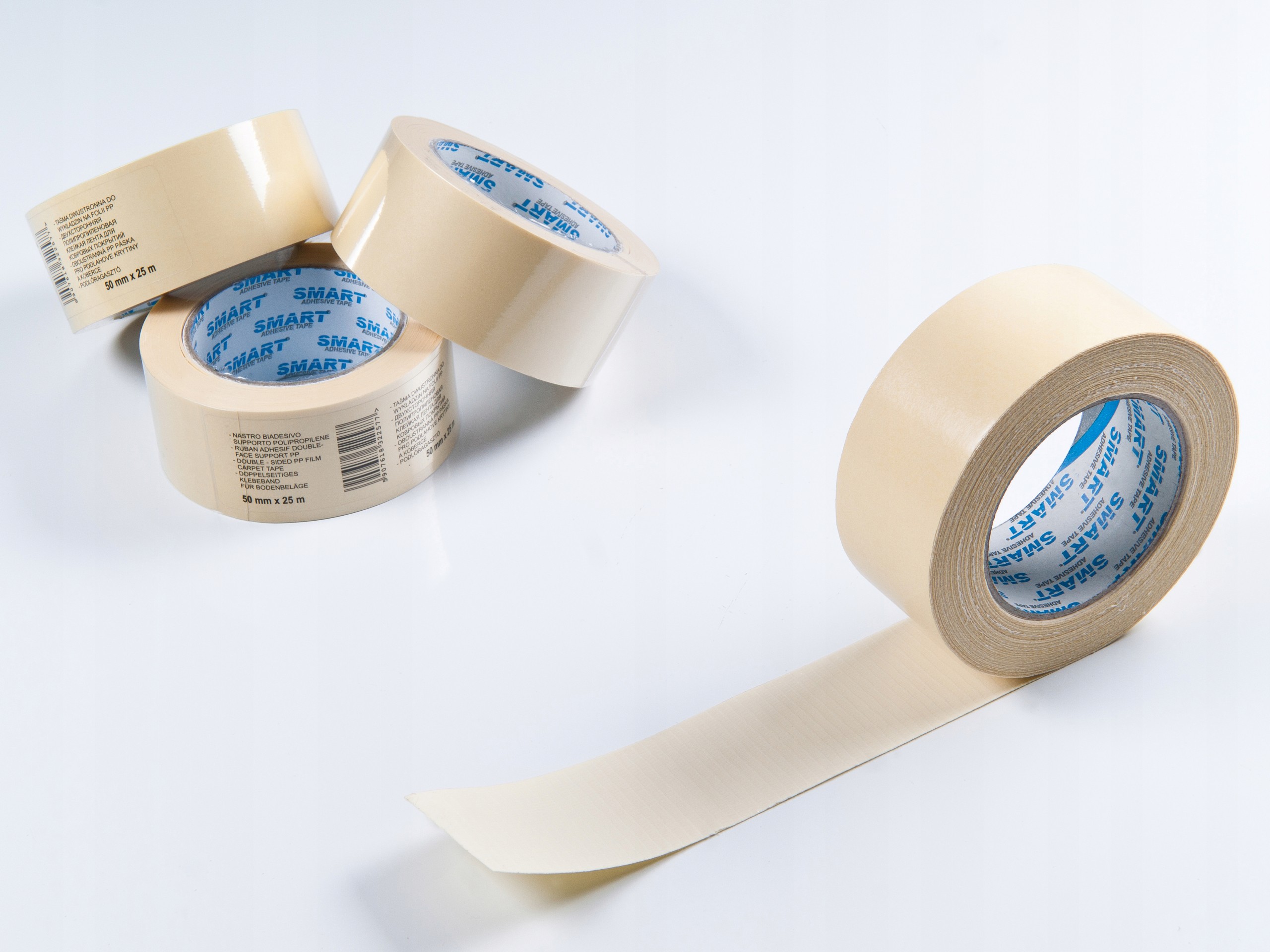 Самоклейка двостороння стрічка використовується для приклеювання, серед іншого: підлогові покриття та багато іншого. Виготовляється з поліпропіленового матеріалу.