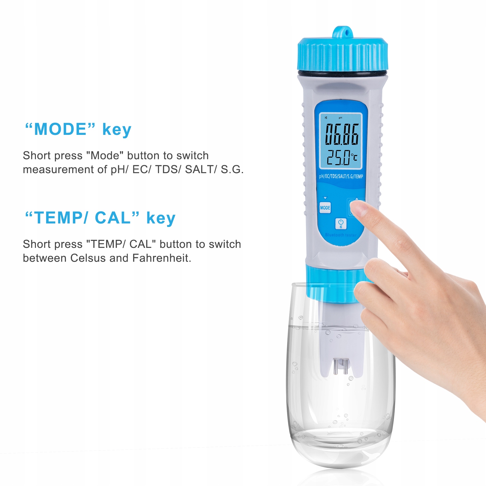 - Багатофункціональний тестер 6 в 1: pH/ eC/ TDS/ сіль/ S.G/ температура, натисніть кнопку «Mode» для легкого перемикання. Одиниця вимірювання температури: ℃/℉.