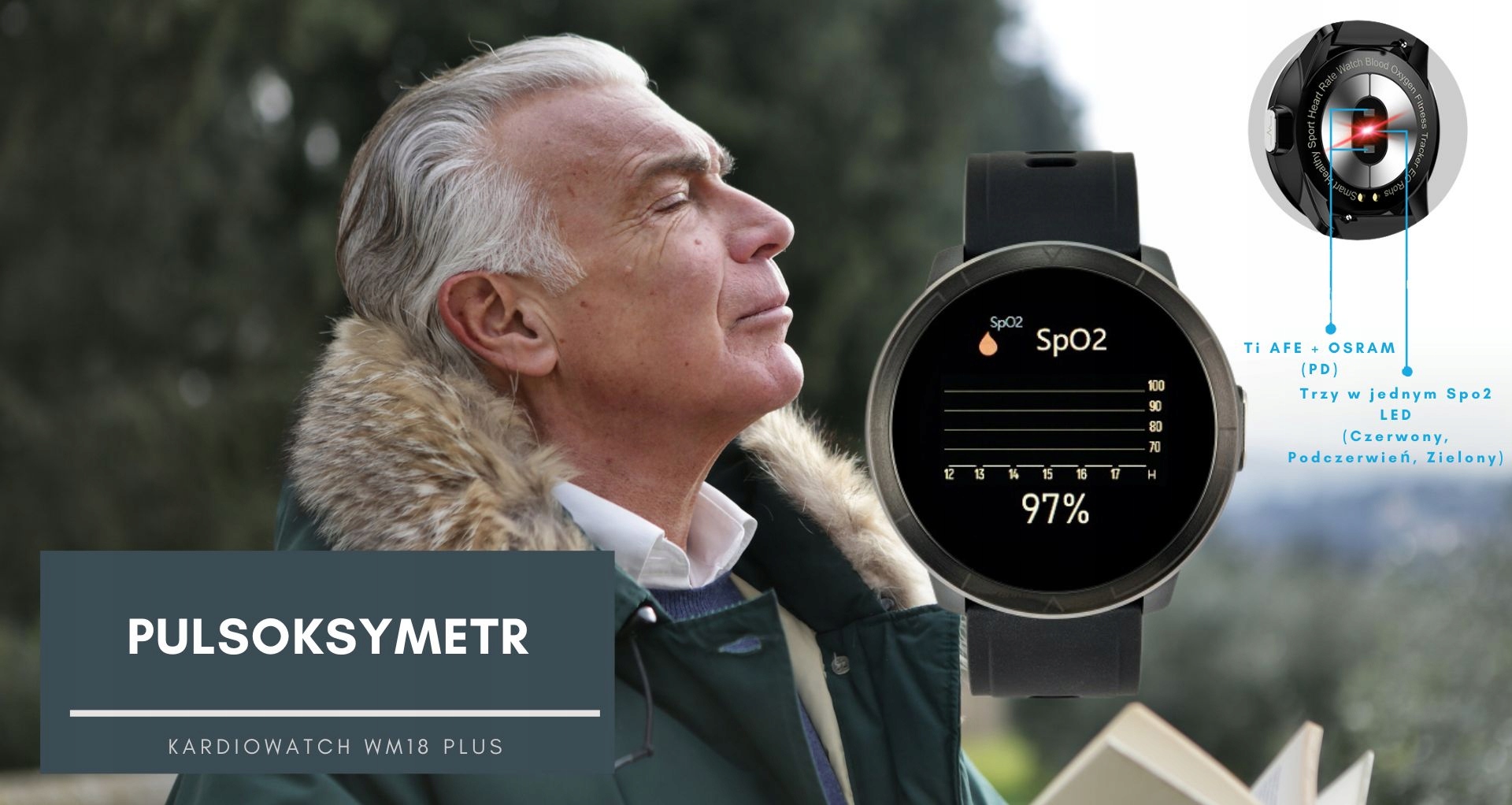 Насиченість, тобто рівень оксигенації крові. Це дуже важливий параметр, завдяки якому ми можемо оцінити своє здоров'я всього за кілька секунд. Нормою вважається рівень насичення від 95 до 100%. Коли рівень оксигенації падає нижче 95%, виникає ризик гіпоксії, стану, при якому наші клітини страждають від гіпоксії. Розумний годинник оснащено ЧІП останнього покоління від Texas Instruments AFE Ti4404 + 2*OSRAM 2703+ OSRAM LED, що робить вимірювання дуже надійними.