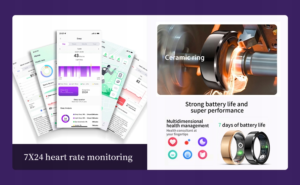 Це розумне кільце використовує енергозберігаючу технологію для забезпечення постійного моніторингу протягом 3–5 днів без заряджання. Виготовлений із нержавіючої сталі медичного класу для комфорту та водонепроникності за стандартом IP68 для довговічності.