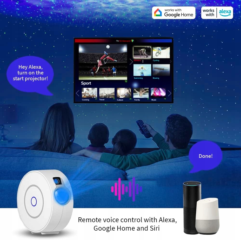 Керуйте проектором з дивана за допомогою пульта дистанційного керування, голосових команд (Alexa/Google Home) або програми на своєму смартфоні. Налаштуйте колір, яскравість і швидкість світла та встановіть таймер для автоматичного вимикання світла, поки ви спите.