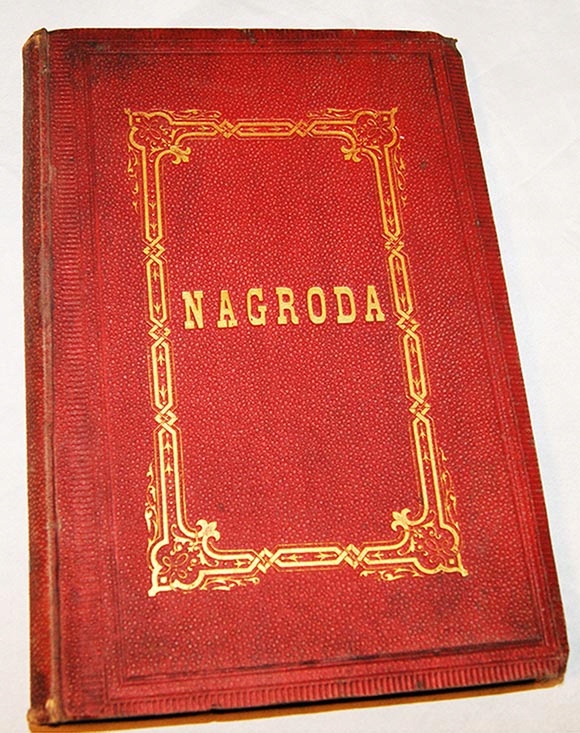 ПЕРІОДИ ТВЕРДОЇ ЛЛЯНОЇ ОБКЛЮЧУВАННЯ, З НАПИСОМ "НАГОРОДА" НА ЛИЦІ, ПОЗОЛОЧЕНОМУ ВІЗЕРУНКІ НАВКОЛ, ОБКЛАДИНКИ З НАСЛІПИМ ТИСНЕННЯМ ДЕКОРАТИВНИХ КОРПУСІВ. НА ПЕРЕДНЬОМУ РІВНІ ІНВЕНТАРИЗАЦІЙНА НАЛІПКА І ПІДПИС ПАЛИТУРНИКА З ВАРШАВИ: А. МОРАВСЬКИЙ.