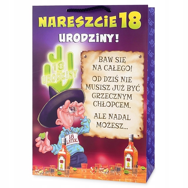 Елегантний подарунковий пакет із смішним напитом 18 -го дня народження. Сумочка, виготовлена з товстого, лакованого паперу.