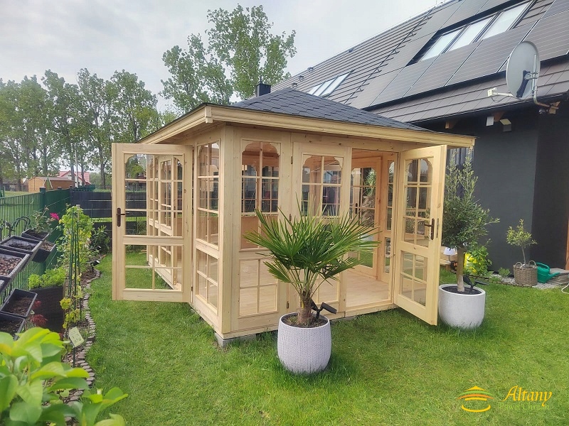 ГАРБОР № 32 - засклений, з висушеної соснової деревини, розмір підлоги 4мх3м (4м по фасаду). Альтанка дуже міцна і стійка. Альтанка має троє засклених подвійних дверей. Альтанка з підлогою без меблів.