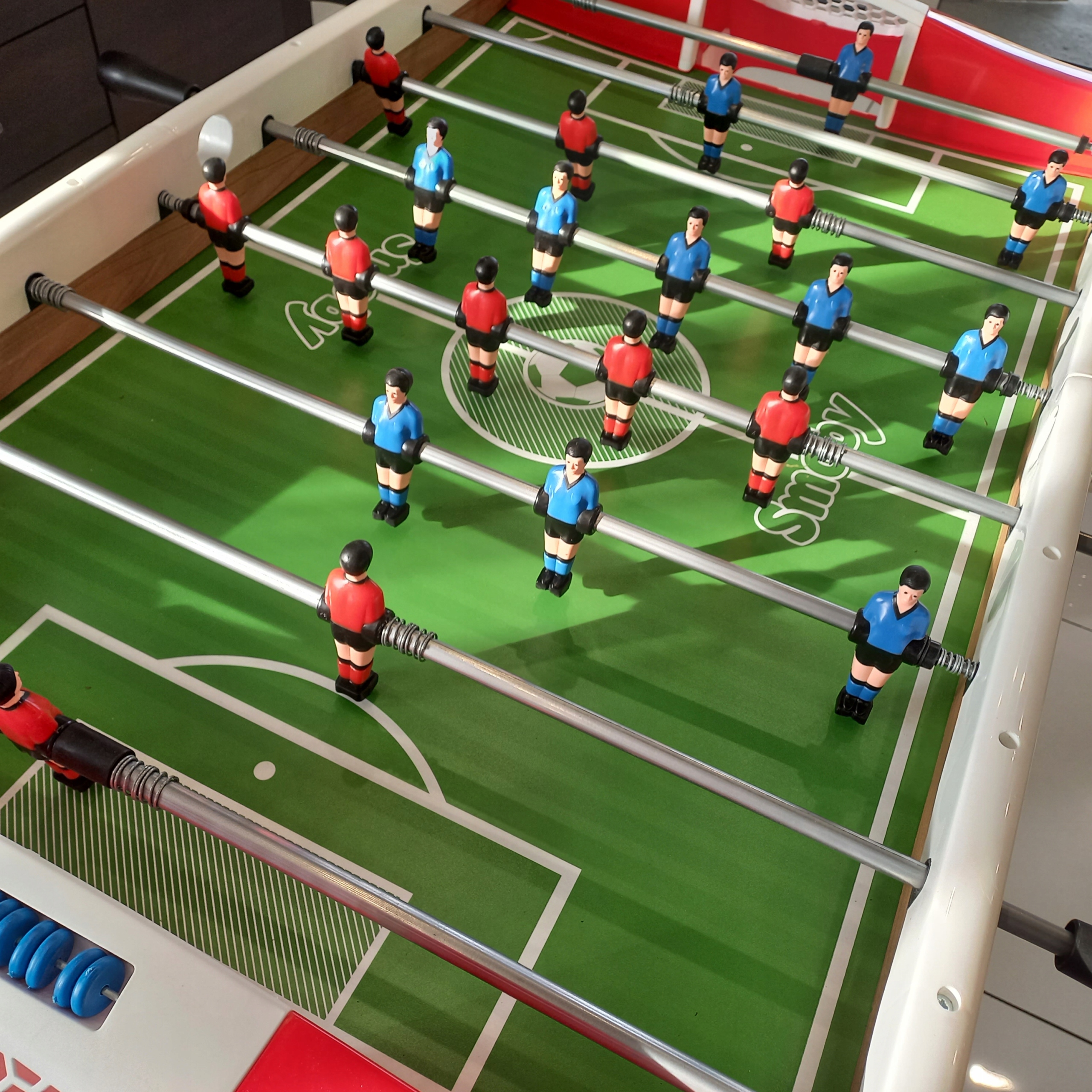 - Стіл для настільного футболу, з ергономічними ручками та епоксидними трубами, на яких розміщуються гравці, з рахівницею для позначення очок, з двома м’ячами в комплекті< /b >.