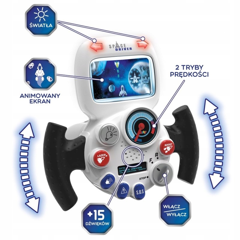 Космічний симулятор водіння — ідеальна іграшка для любителів подорожувати космосом. Дитина може зручно розташуватися за кермом, поставити ноги на педалі і вилетіти в подорож космічним кораблем.