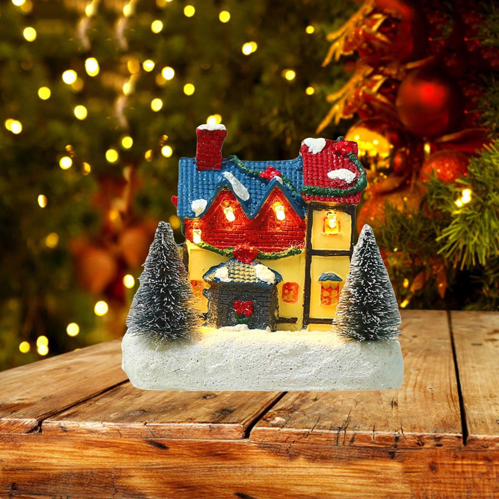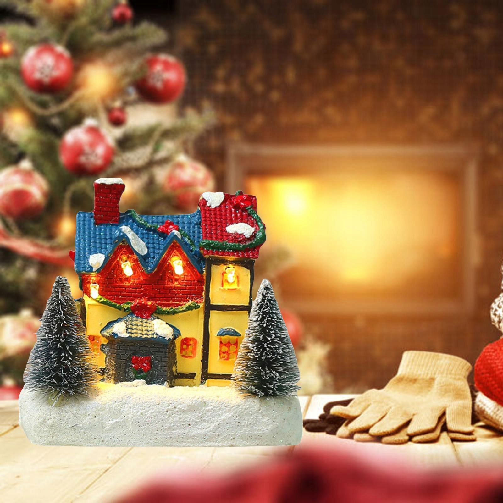 Смола міні -різдвяний будинок світлодіодне тепле світло. Сільський домашній стіл сніжна сцена c