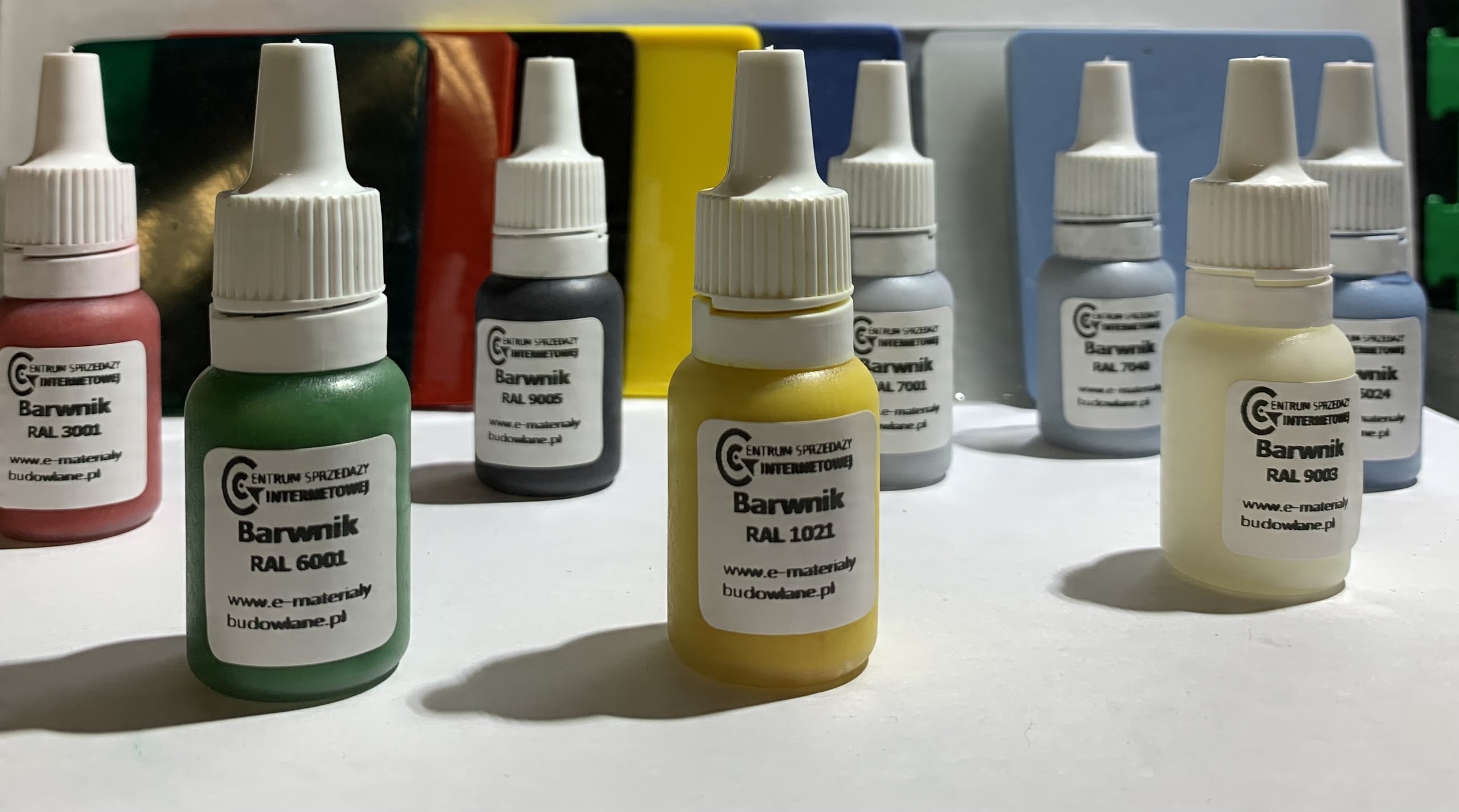 - У випадку поліуретанових смол, рекомендується спочатку змішати відміряну кількість пігментної пасти з компонентом A (смола) і лише потім додайте вже забарвлений поліоловий компонент В (затверджувач). Наприклад, 20 г барвника достатньо для фарбування 1 кг поліуретану та епоксидної ливарної смоли.