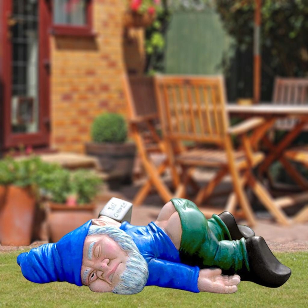 Смоляний садовий гном, що лежить на галявині, карликова скульптура, настільна декорація на відкритому повітрі