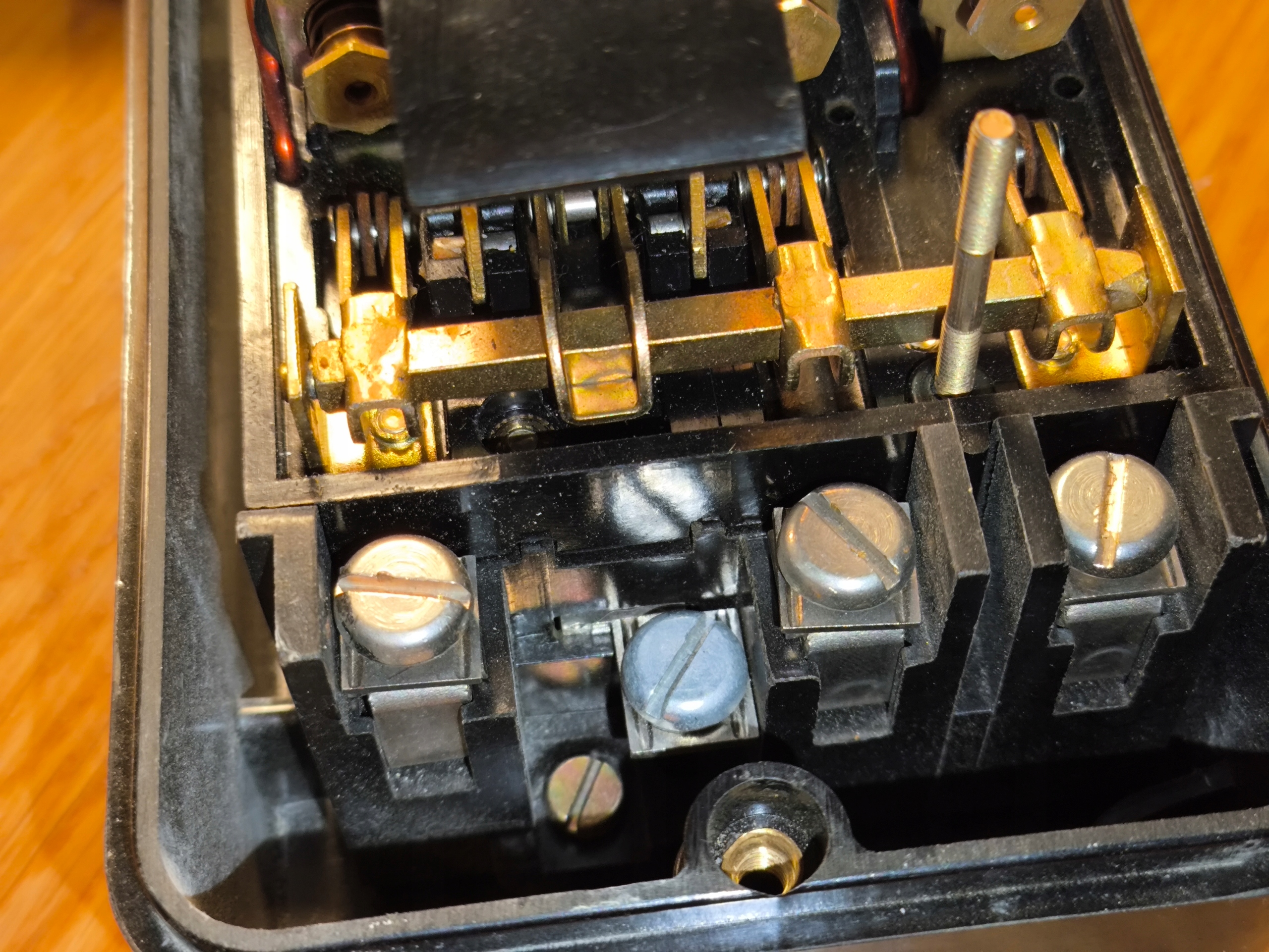 Важливо, що ця модель також оснащена функцією захисту від надмірного струму завдяки електромагнітному механізму з котушками. У разі перевищення допустимого струму (10-15 А) комутатор автоматично відключає схему ("спрацьований" стан). Перемикання потребує перенесення важеля в нульове положення. Внутрішній механізм містить дві котушки та гвинтові з'єднувачі для з'єднання кабелів. Передня пластина з даними розміщується спереду: