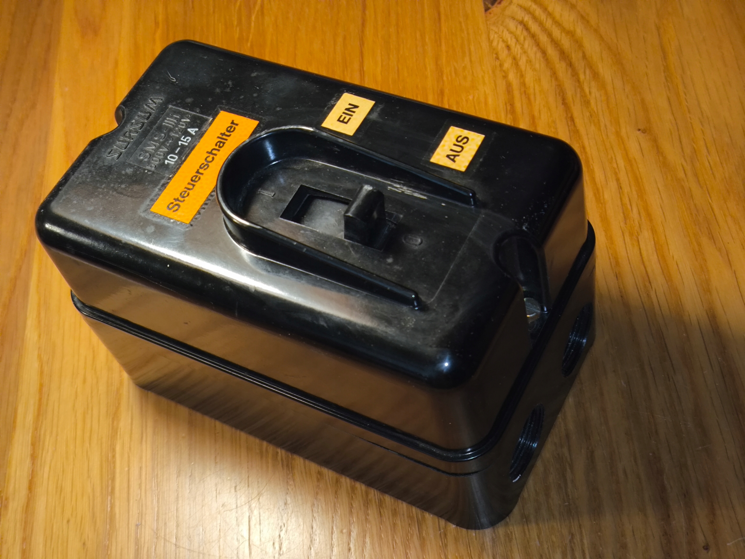 Тема пропозиції-це промисловий перемикач німецької компанії Sursum, SMS-IIII-модель, укладений у твердий чорний будинок, зроблений з Bakelit. Пристрій діє як основний вимикач або безпека в електричних установах, що дозволяє та вимикати джерело живлення за допомогою механізму важеля.