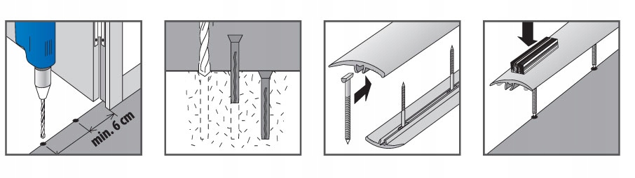 Поріжки довжиною 180 см, шириною 30 мм виготовлені з ПВХ. Вони дозволяють з’єднувати різні поверхні підлоги, наприклад, панелі з панелями, панелі з килимом, панелі з плиткою тощо. Вони усувають перепади рівня до 8 мм. Спосіб кріплення непомітний. Поверхня покрита міцним ламінатом, значною мірою стійким до стирання.