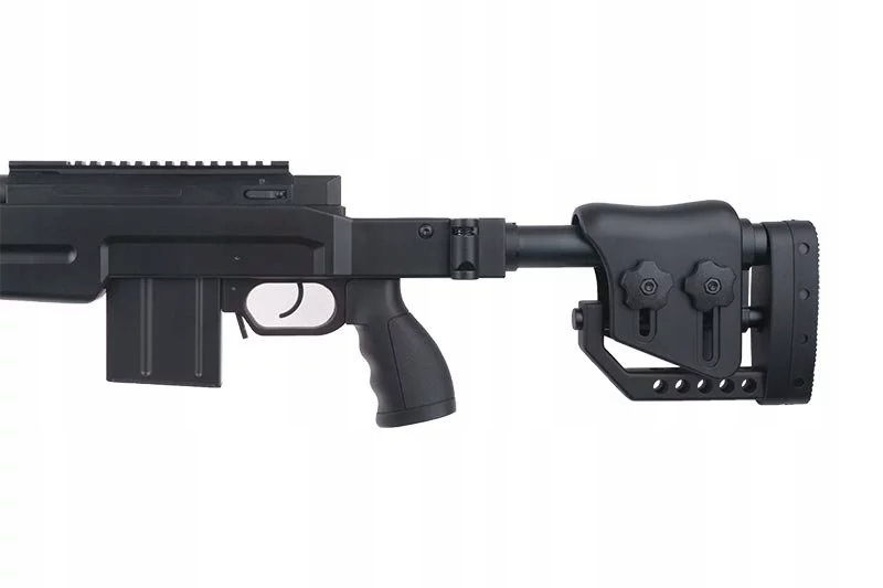 Ручка регулювання системи Hop-Up розташована внизу ліжка. Це забезпечує миттєвий доступ, а налаштування Hop-Up можна скорегувати на ходу, навіть під час стрільби. Ложа репліки оснащена телескопічною прикладою з плавним регулюванням довжини та щокою, що регулюється по висоті за допомогою 4 гвинтів. Приклад можна скласти в бік репліки для зручності транспортування.