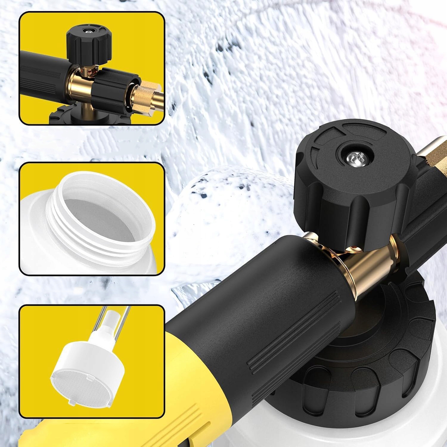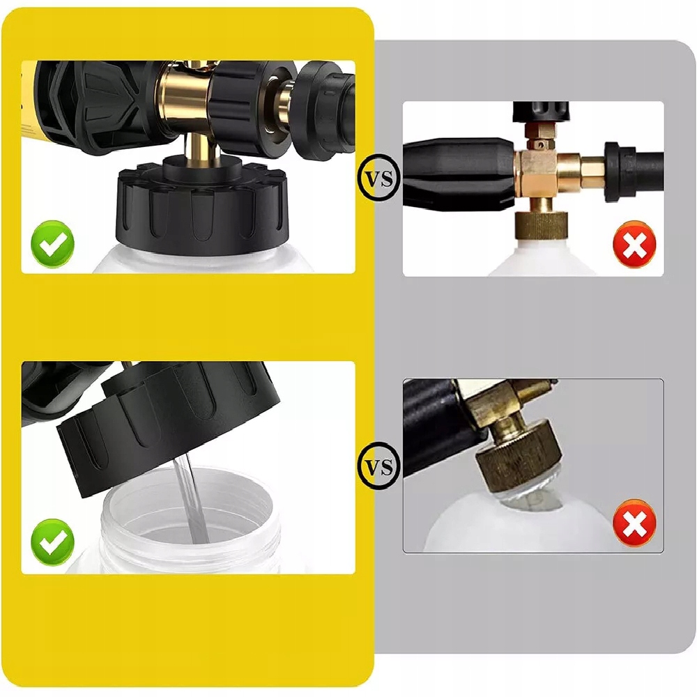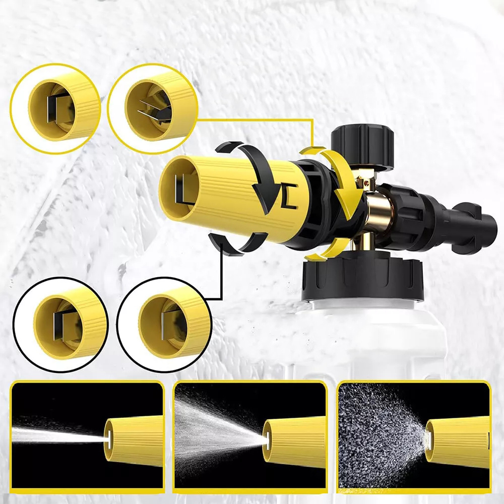 1. Виготовлений із міцної латуні та високоякісного пластику, він стійкий до корозії та протікання, що забезпечує герметичність печатка. 2. Посилена широка горловина запобігає тріщинам і полегшує додавання мила та води. 3. Легка заміна форсунки - просто відкрутіть гніздо M22 і під’єднайте чорний адаптер Kärcher, щоб перевірити та замінити форсунку.