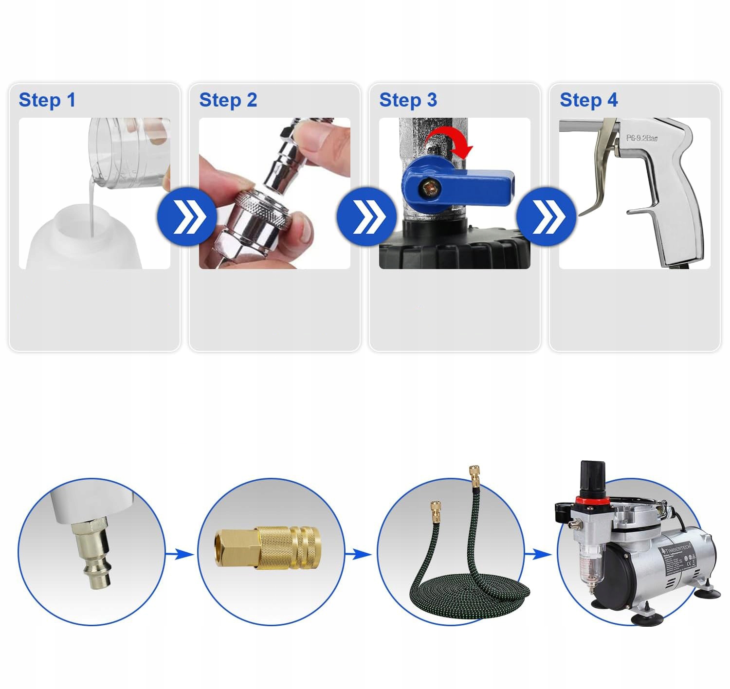 ➡ підключення: європейський плагін; Матеріал ручки: алюміній; Розмір з'єднання: 10 мм; Вхід повітря: 1/4 (дюйм); Тиск: 6-9.2 бар; Довжина інструменту: 320 мм; Ємність: 1000 мл; Вага: прибл. 0,67 кг.