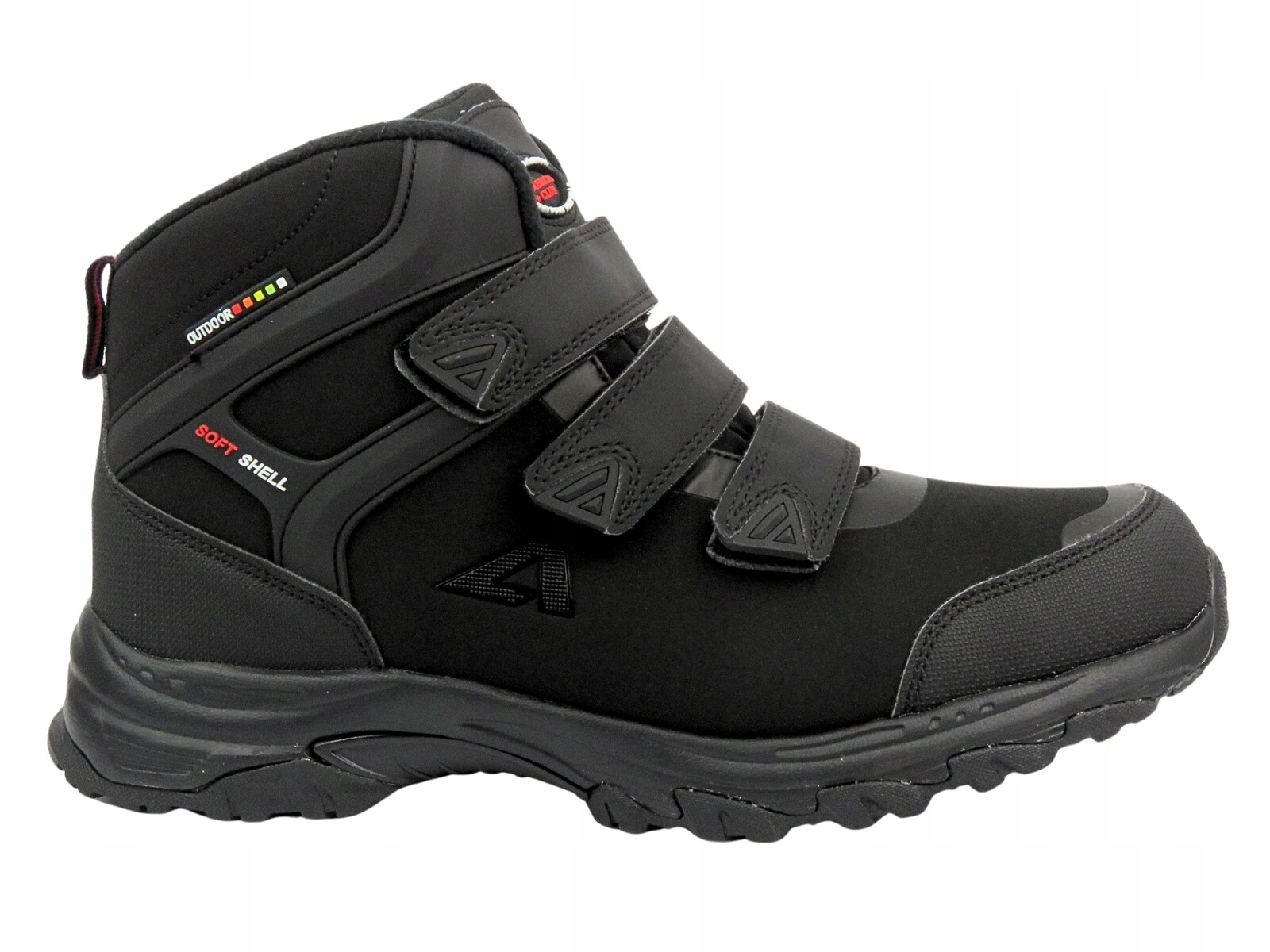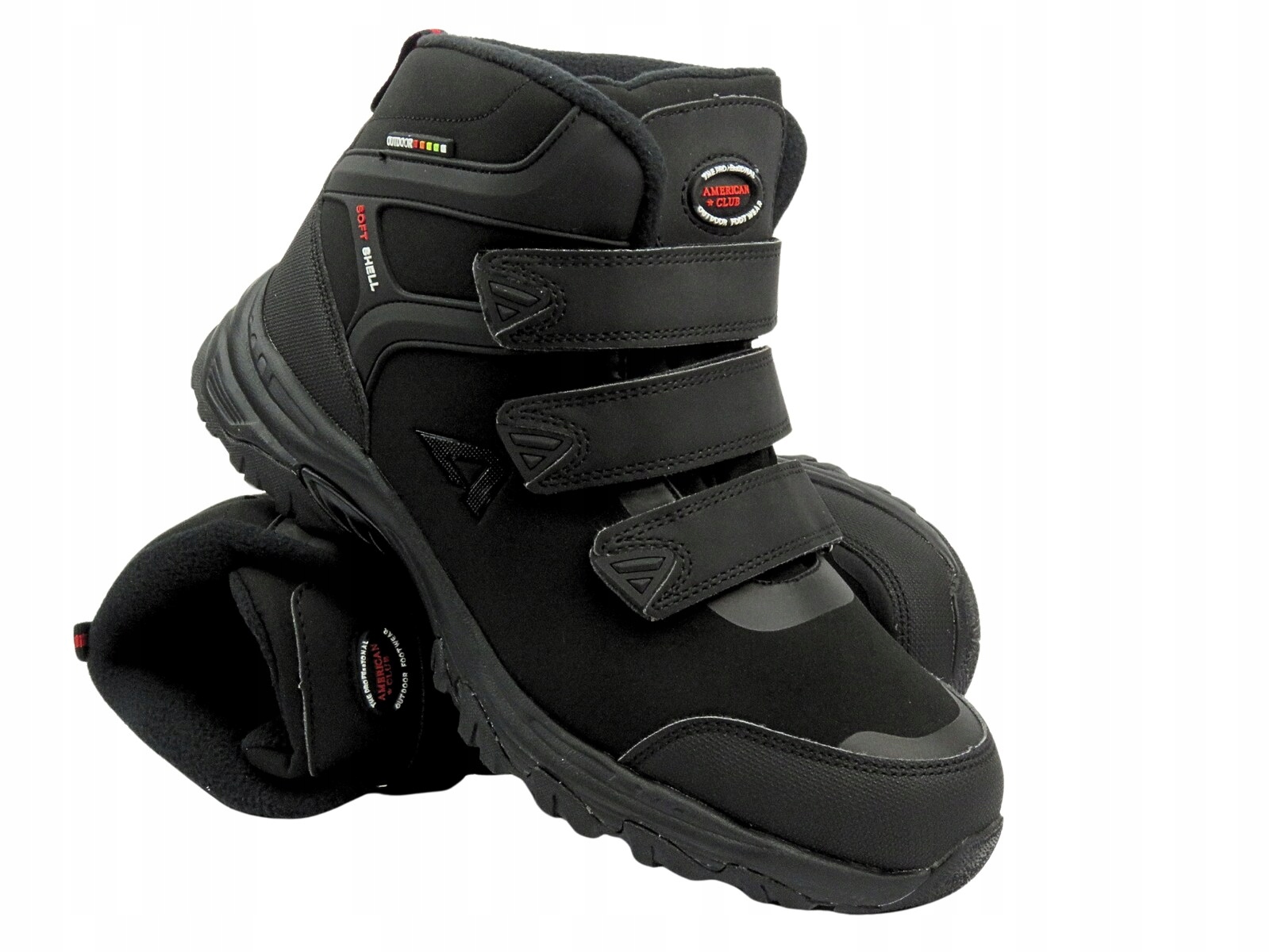 Верхній чоловічий сніговий чоботи американського клубу виготовлено з екологічної шкіри технологічно передового матеріалу Softshell та . Зовнішні шари Softsehell забезпечують вестибуль і більшу водостійкість , тоді як його внутрішні шари дозволяють підтримувати належний рівень тепла посередині взуття. Весь має дихаючі властивості , а також м'які, легкі та гнучкі , завдяки якому він забезпечує високий комфорт . 4 Кріплення на три липучки дозволяє швидко надіти взуття і добре відповідати верхній до ноги. Підошва з агресивним протектором забезпечує хорошу адгезію на землю та стабільність ходьби.