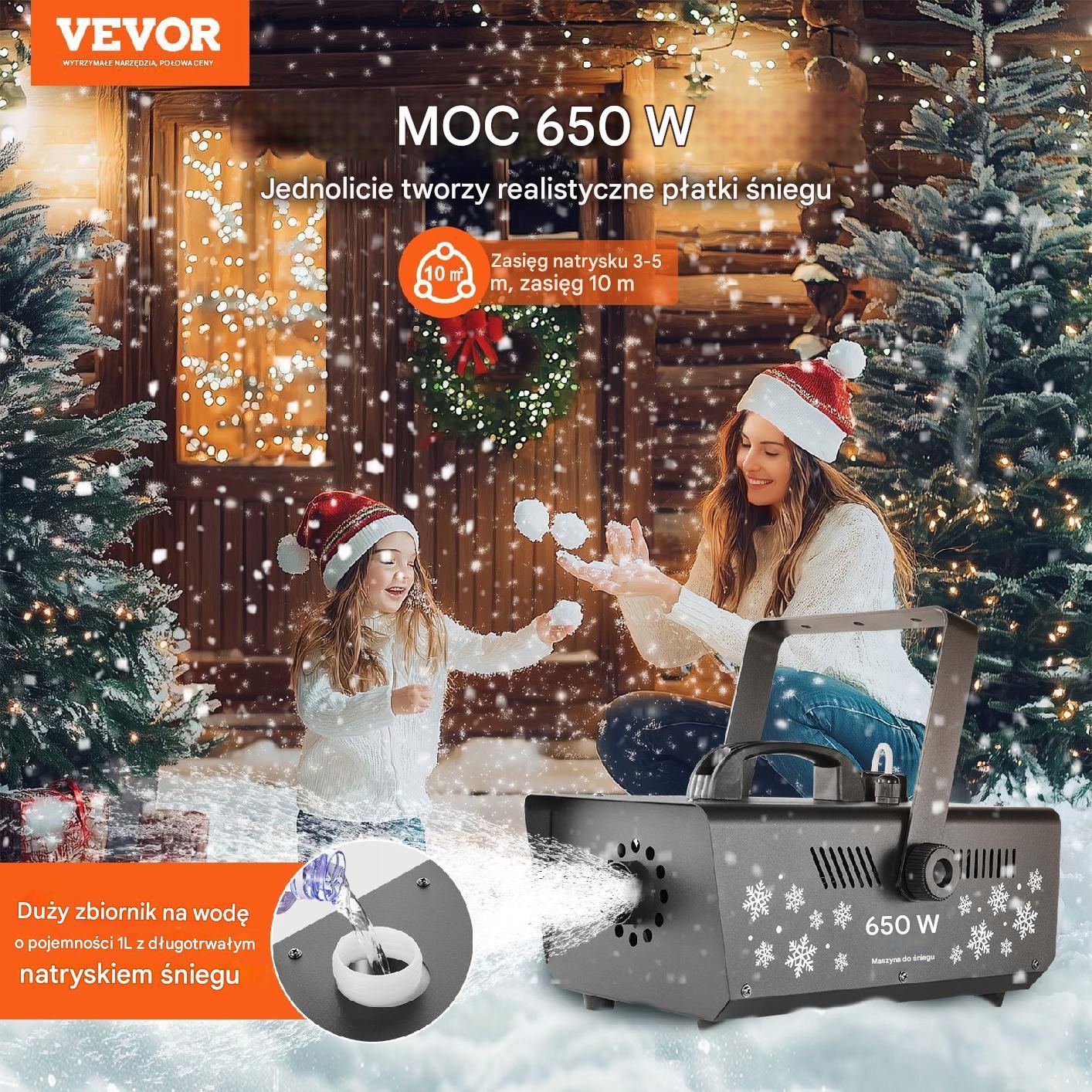 Машина для виробництва снігу з двигуном 650 Вт та 1 -літерним резервуаром для води генерує безперервний потік реалістичних сніжинок. Діапазон розпилення від 3 до 5 метрів та 10 м² зона покриття дозволяє створити чарівну зимову атмосферу.