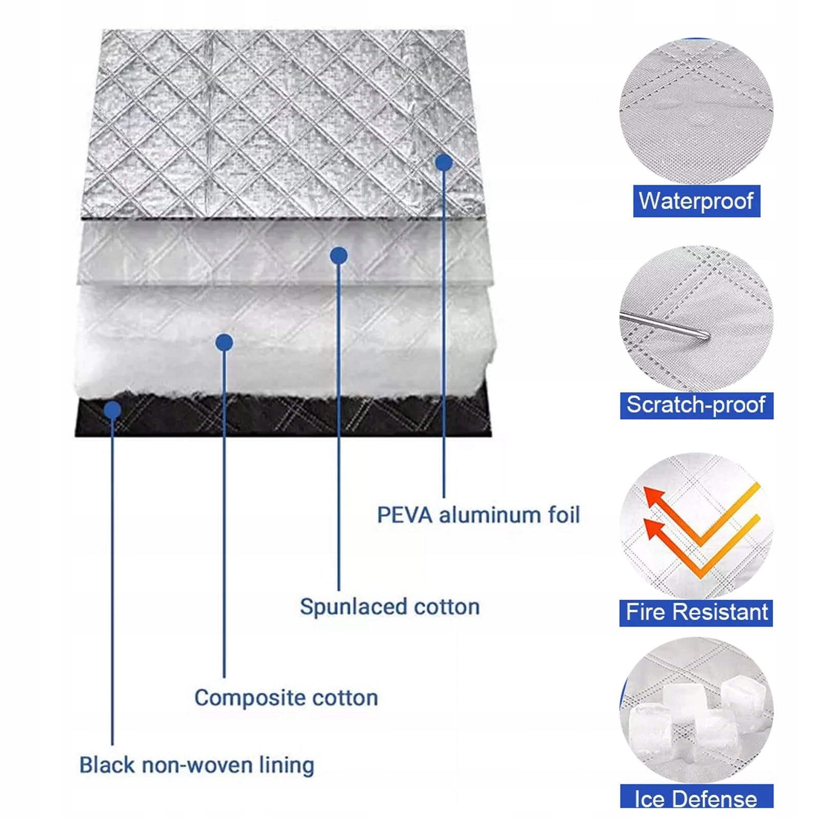 - ⭐ Козирок для захисту від замерзання заднього скла складається з 4 шарів. Дизайн: автомобільний чохол виготовлений з алюмінієвої фольги PEVA, яка відбиває сонячне світло, є водонепроникною та стійкою до розривів, бавовна спанлейс ізолює тепло та холодне повітря, а композитна бавовна ефективно запобігає проникненню низьких температур у салон автомобіля. Міцні шви запобігають розриву чи подряпинам чохла та зберігають ваш автомобіль у ідеальному стані під час використання. Коли він не використовується, його можна скласти для зручного зберігання.