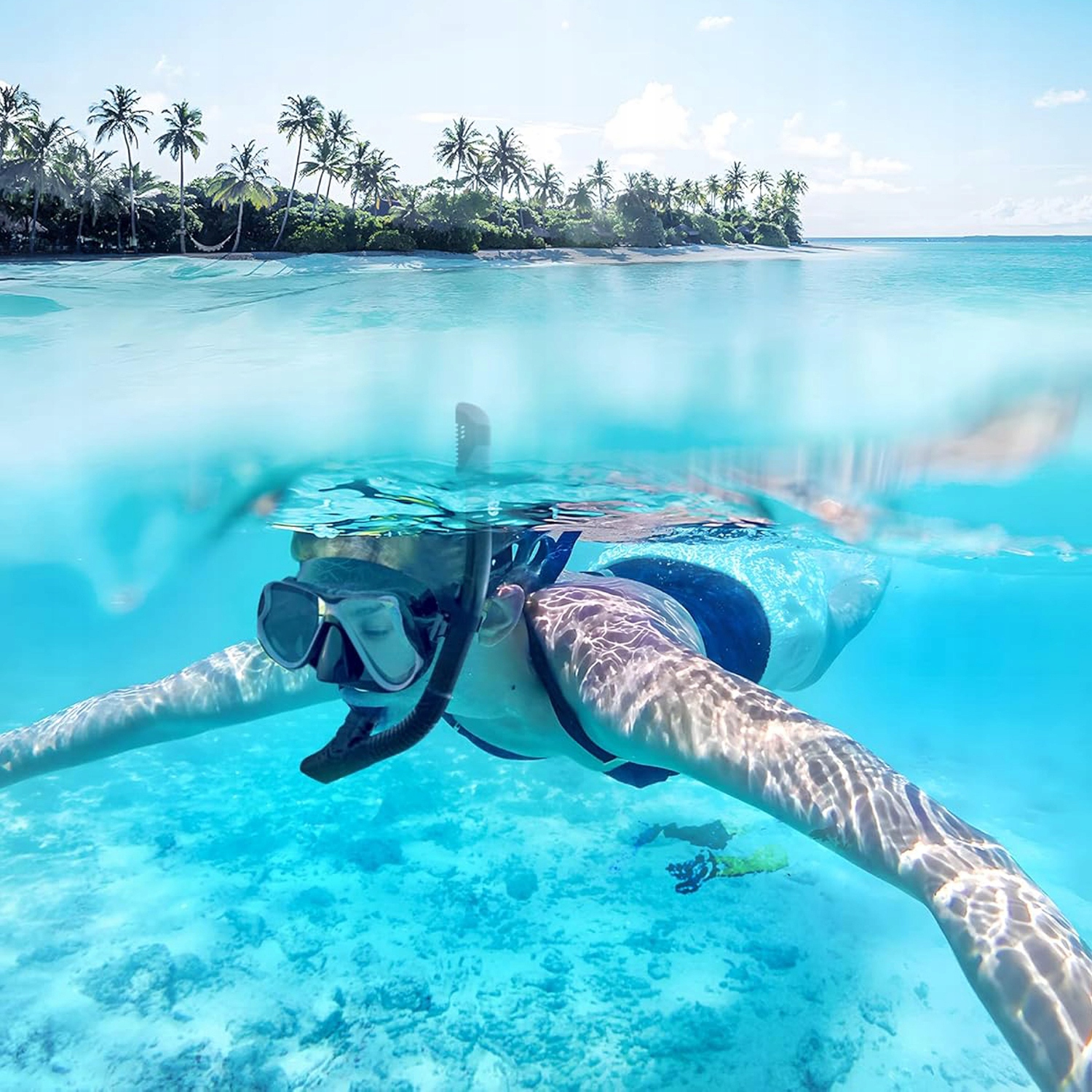 Маска для сноркелінгу має структуру з чотирма вікнами, загартованими скляними лінзами та низькою алергією силіконової спідниці, яка витримує тиск під водою під час дайвінгу та сноркелінгу, забезпечуючи найвищий комфорт. Спідниця для дайвінгу була розроблена з м'якого та гнучкого силікону, а силіконова маска їжі може створити водонепроникну ущільнювач з обличчям кожного водія, ідеально пристосовуючись до рота без запаху.