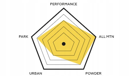 HYBRID: профіль RESORT V3 дає вам найкраще з обох світів. Він має центр, піднятий із традиційним вигином за межі вставок для утримання кромки на високих швидкостях у змінному рельєфі, підняті контактні точки для приземлення та плавання в порошку, а також традиційні вигини в носі та хвості для плавніших переходів.