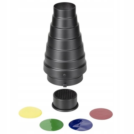 Накладання, яке використовується для фокусування променя світла спалаху. З його допомогою можна додатково виділити виділений фрагмент композиції. У набір також входять шаблони, які дозволяють досягти цікавих світлових ефектів. Кришка має кріплення типу Bowens і сумісна з широким спектром аксесуарів Quadralite, Bowens та інших альтернативних виробників.