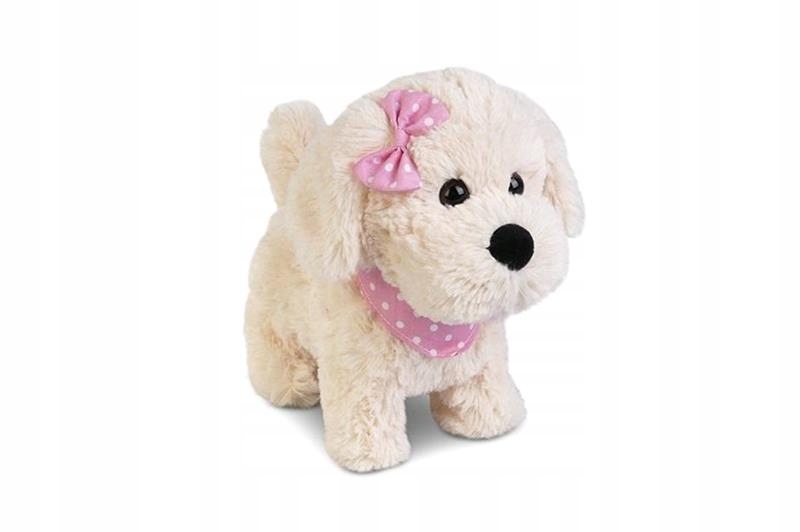 Песик прикрашений рожевим шарфом і рожевим бантом з білими крапками. Має розмір 21 см. Собака виконує різні функції: ходить, гавкає, виляє хвостом. До собаки йде рожевий повідок. В упаковці є інструкція до шнурка. Для роботи іграшки потрібні 3 батарейки АА 1,5 В (не входять в комплект).