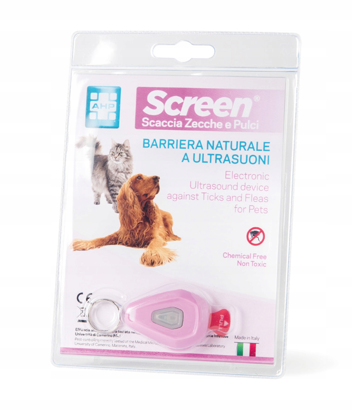 Ця невелика захисна бирка для нашийника є ідеальним рішенням для захисту від кліщів і бліх від котів і собак повністю екологічним способом і без будь-яких протипоказань. SCREEN Ticks and Fleas не виділяє хімічних речовин і запахів. Він працює, випромінюючи ультразвукові імпульси, які не завдають шкоди людям і тваринам.