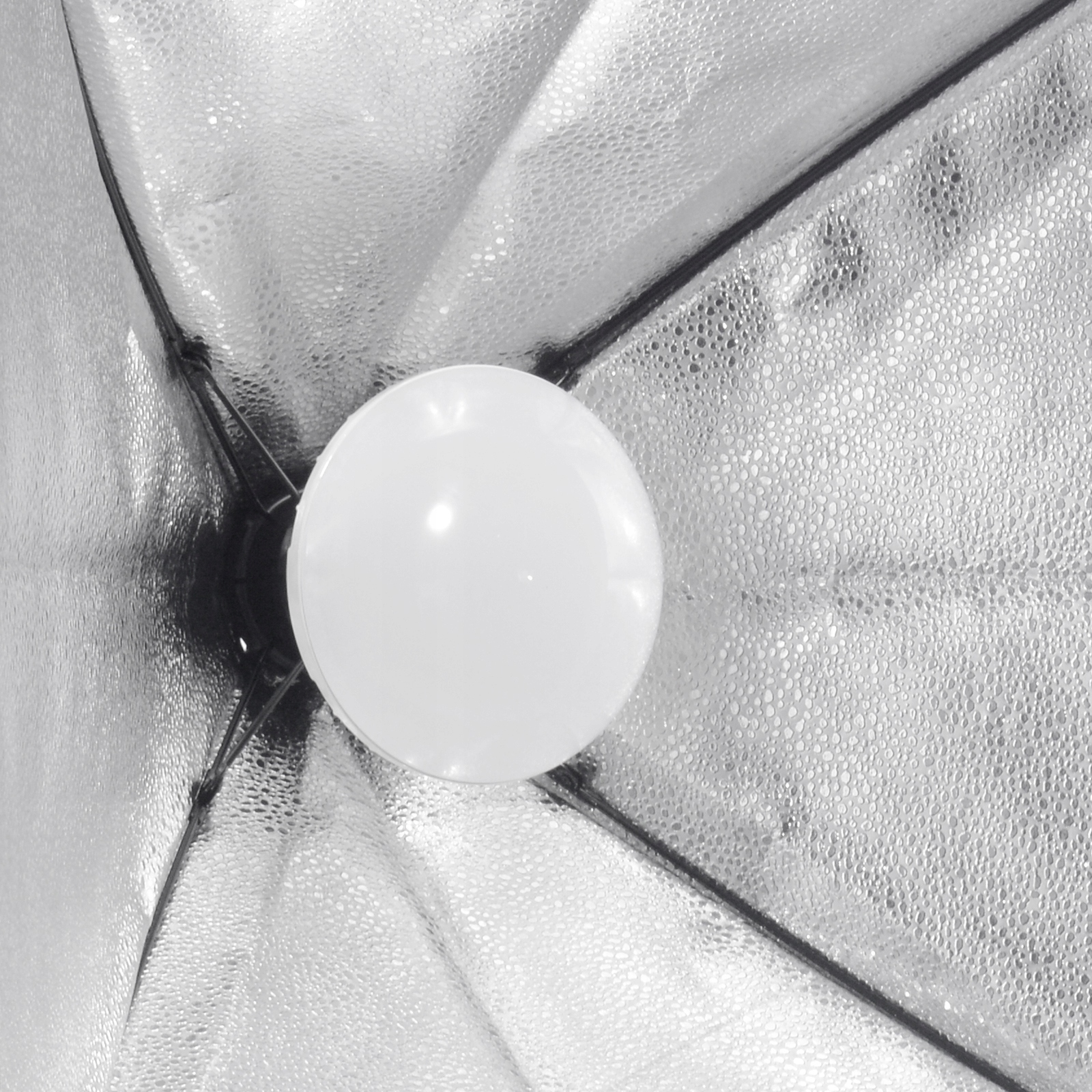 Зовнішній шар виготовлений із тканини Оксфорд, стійкої до зношування та пошкоджень під час транспортування, а внутрішній шар із високим ступенем відбиття покращує відбиття світла. Загартовані сталеві ребра абажура забезпечують високу міцність і стабільність, а розсіювачі пом’якшують світло, створюючи чіткі та природні деталі.