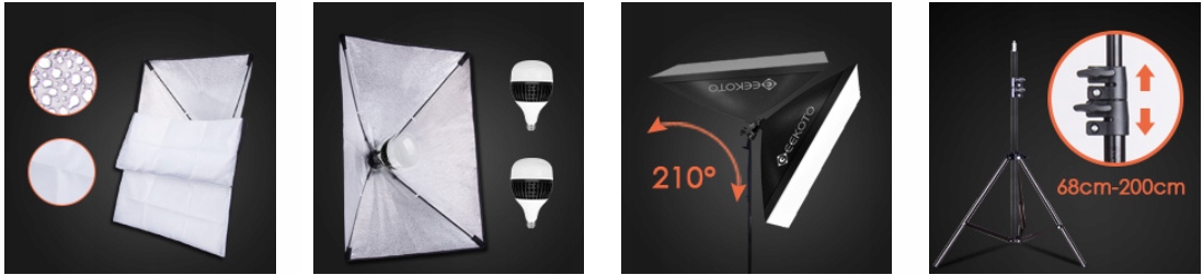 Оснащений підсвічуванням головка регулюється на 210°, софтбокс легко регулюється під різними кутами залежно від ваших потреб зйомки. Завдяки незалежній кнопці фіксації ви можете встановити потрібний кут всього за кілька секунд, тому ви можете використовувати софтбокс як основне або додаткове освітлення за вашим бажанням.