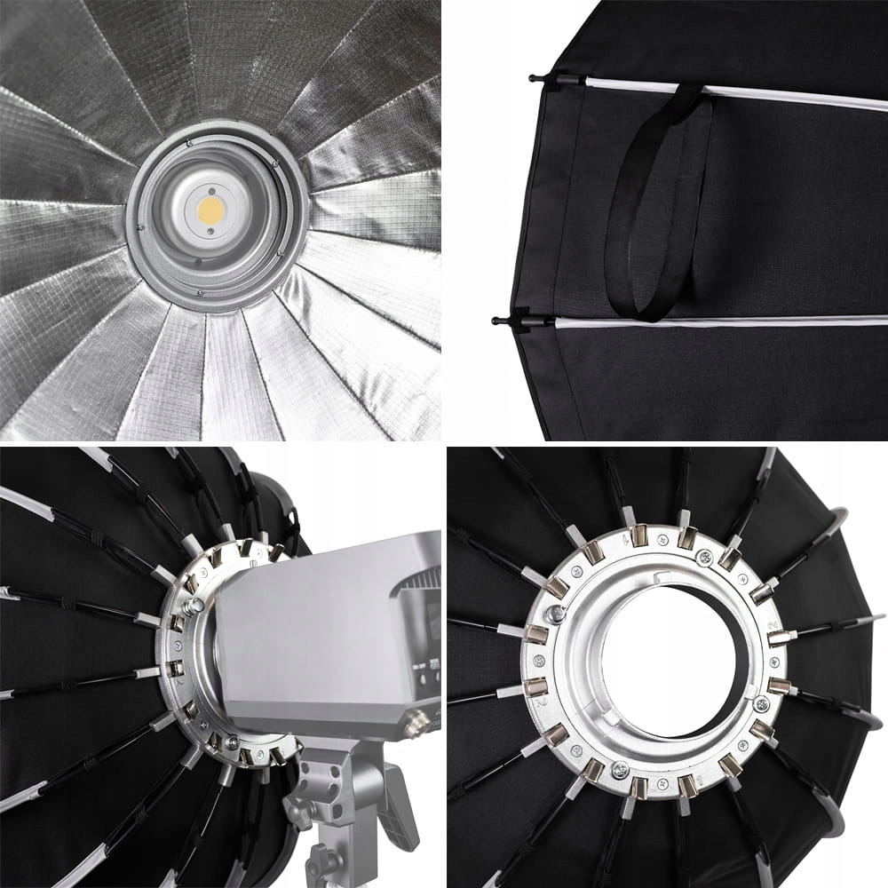 Структура рами з дротами, що проходять поза чашею, робить внутрішню частину софтбоксу MITOYA MOTION порожньою, і жоден конструктивний елемент не закриває пальник лампи. Випромінюване світло поширюється рівномірно, і на розсіювачі не утворюються небажані тіні. Це рішення особливо цінно при створенні відео та роботі зі світлодіодними лампами. Сріблястий світловідбиваючий шар всередині плафона додатково заломлює та підсилює світло, що дозволяє максимально використати потенціал лампи.