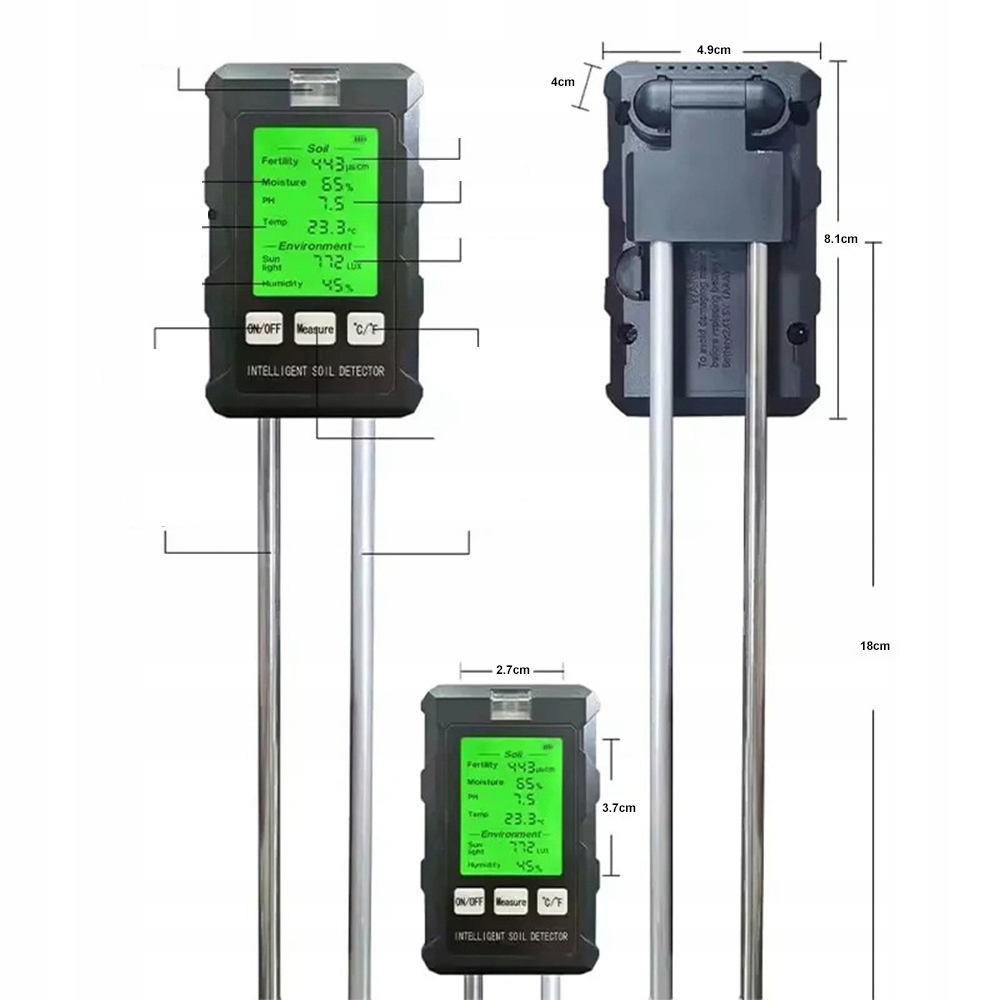 Може визначати родючість ґрунту, рівень рН, температуру, вологість, світло та вологість повітря.