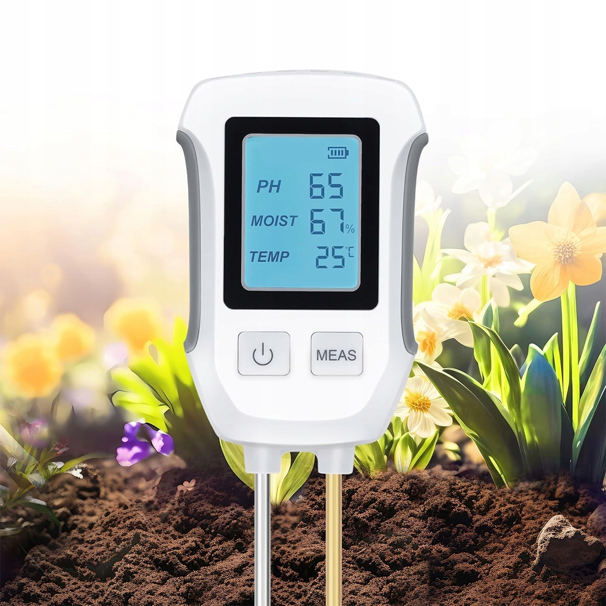 Вимірювач вологи ґрунту забезпечує точні показники pH, вологи та температури ґрунту. Просто вставте зонд Soil Physics Test Kit на глибину приблизно 5-10 см у ґрунт і натисніть кнопку «Виміряти». Дані зчитуються миттєво - просто підключи та працюй! РК-дисплей із підсвічуванням забезпечує хорошу видимість як удень, так і вночі та бездоганно працює навіть за змінних умов освітлення.