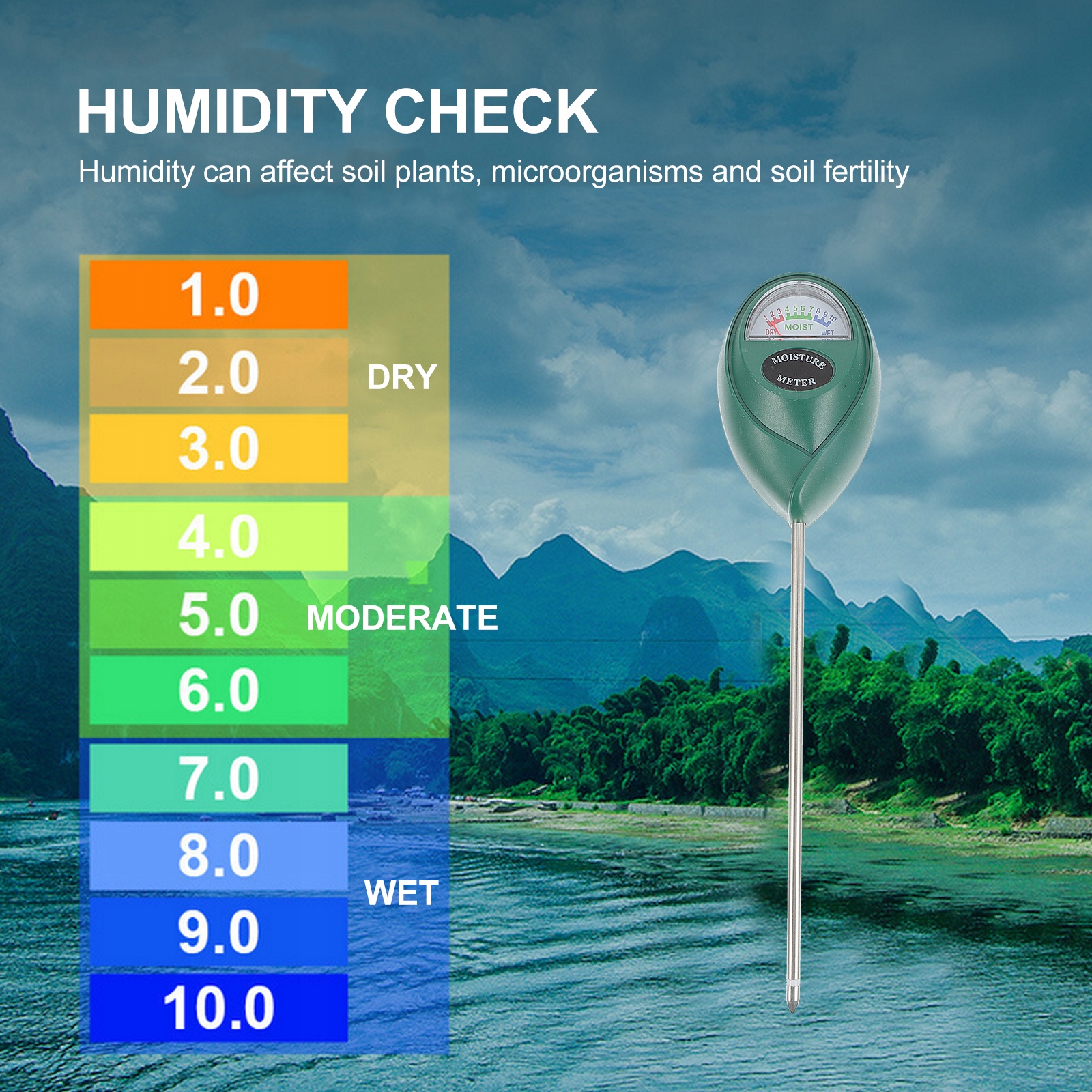 Це тестер ґрунту, виготовлений із високоякісних матеріалів, міцний і може використовуватися протягом тривалого часу. Виявлення однією голкою, швидше та точніше виявлення та аналіз ґрунту. Вологість ґрунту можна точно контролювати та своєчасно регулювати відповідно до потреб води в будь-який час.