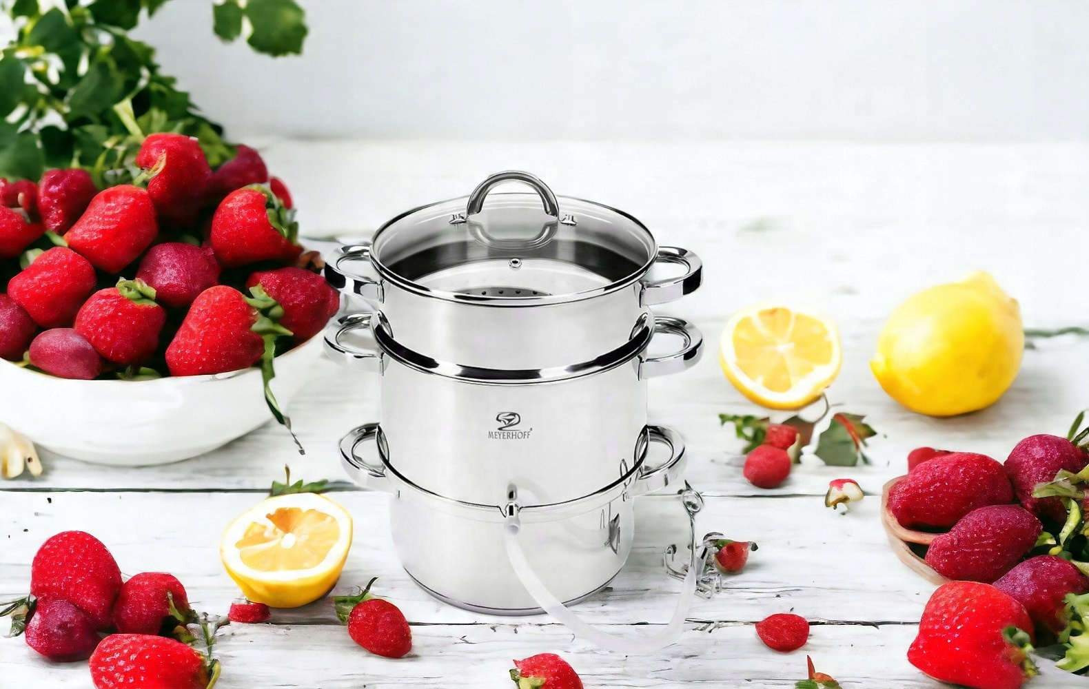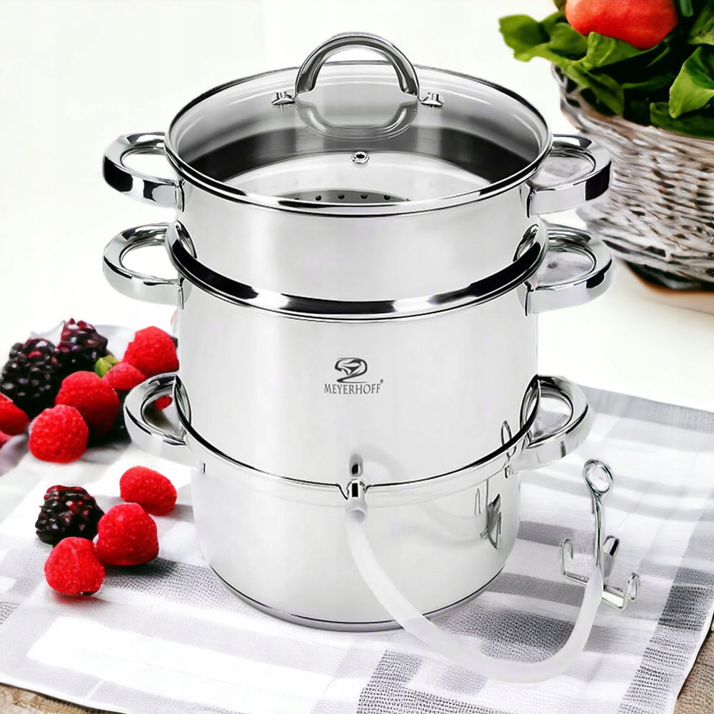 Соковижималка Meyerhoff виготовлена з нержавіючої сталі найвищої якості. Відповідна товщина стінокі багатошарове днодозволяють дуже швидко і рівномірно нагріватися соковижималці і підтримувати постійну температурувсередині. Завдяки цьому процес приготування соку триває від 30 хвилин до максимум 1 години - все залежить від твердості фруктів.