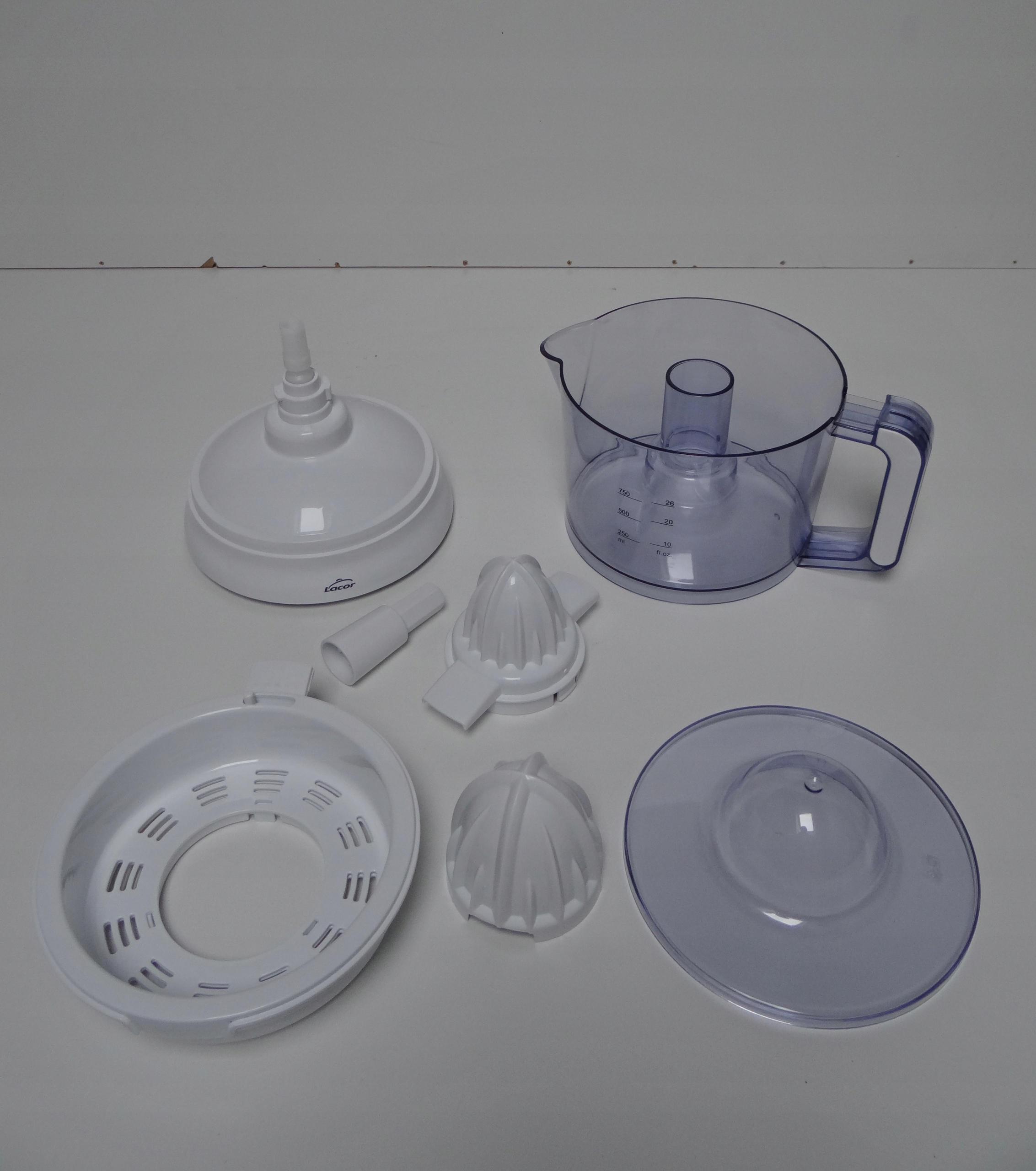 - Включно з двома змінними конусами різних розмірів для віджимання соку різних розмірів (підходить для усіх видів цитрусових), прозорий захисний ковпачок та буклет з інструкцією (може бути недоступним у польський)