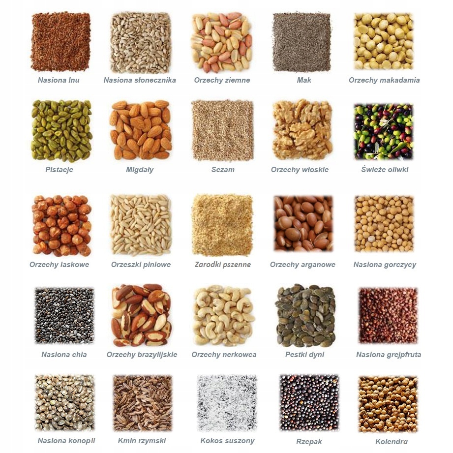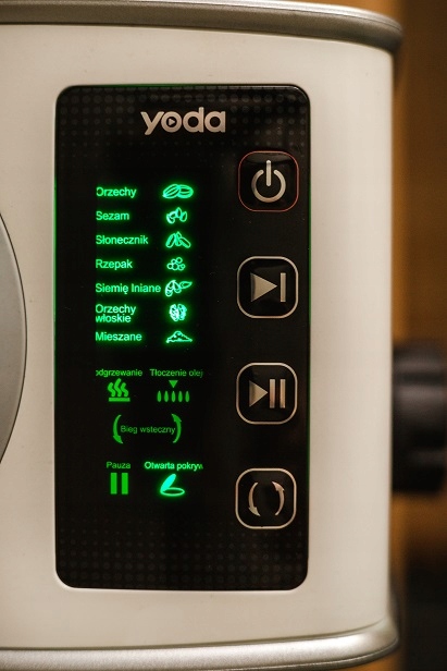 Yoda має сім програм віджиму: горіхи, кунжут, соняшник, рапс. , Лляне насіння, волоський горіх, інше. Вони відрізняються температурою валу дроблення та силою дроблення, адаптованою до специфіки екструдованих продуктів. Все, що вам потрібно зробити, це вибрати програму, адаптовану до вибраного інгредієнта, і процес пресування почнеться автоматично. Йода добуватиме олію з насіння соняшнику, гарбуза, арахісу, волоських горіхів, фундука, макадамії, кунжуту, льону, чіа - іспанської шавлії, коноплі, кокоса, сирих оливок та багатьох інших.