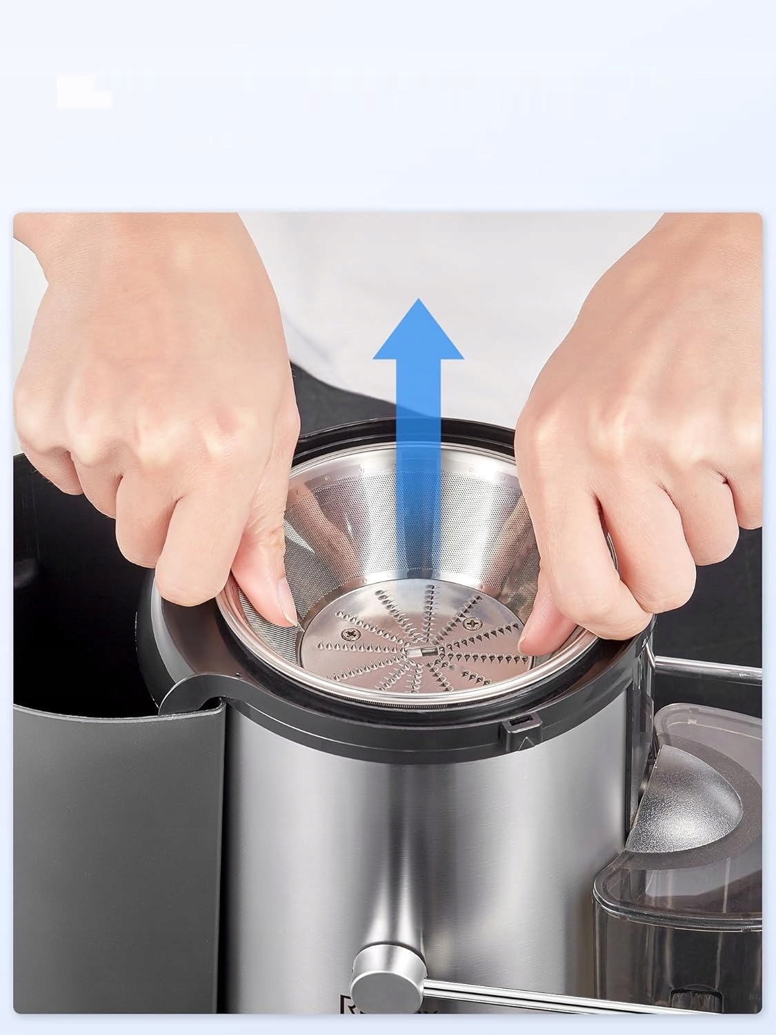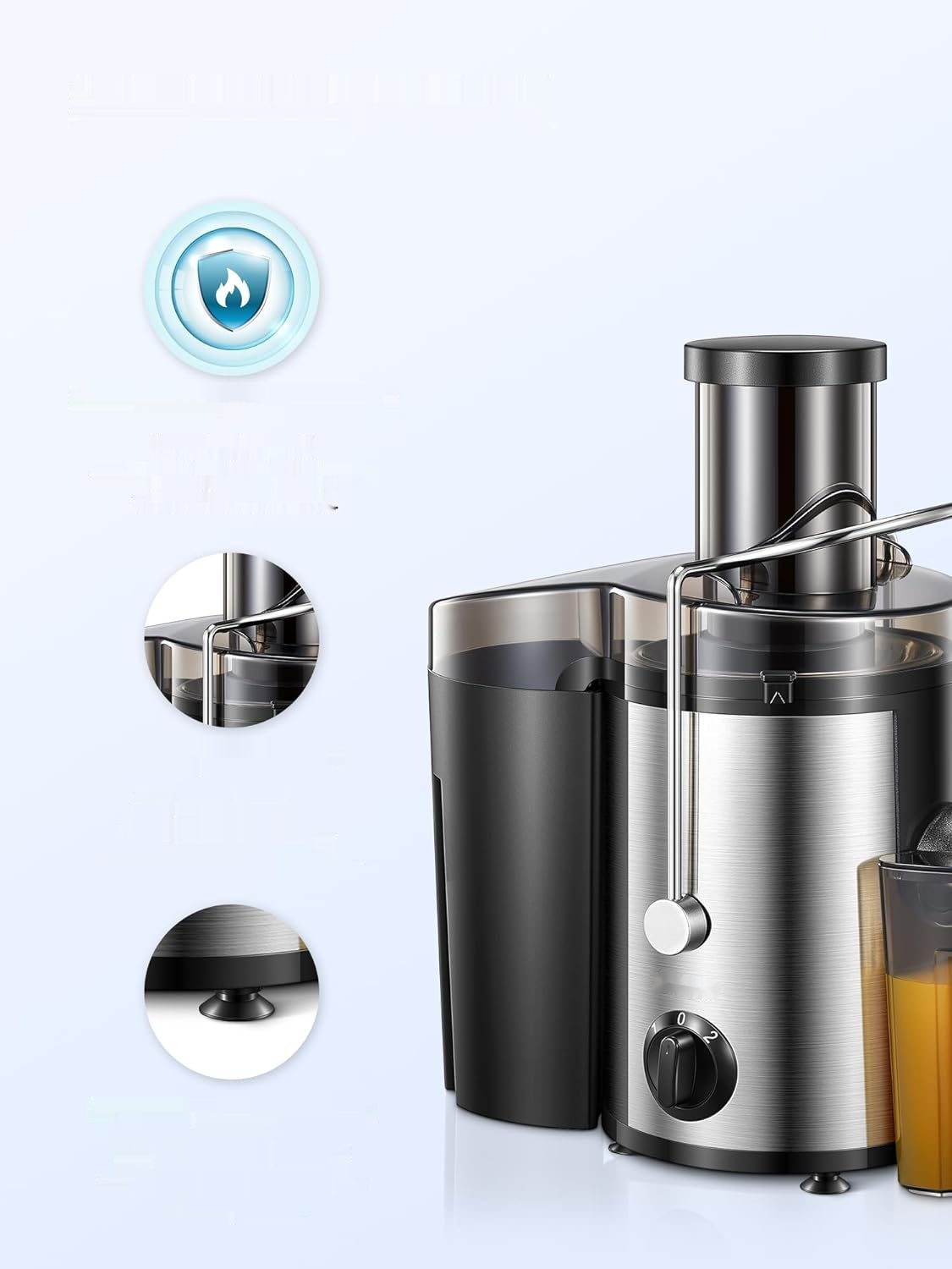 ✅ Безпечний дизайн і легкість очищення: соковижималка з фіксатором не працює без закритої кришки. Система захисту від перевантаження вимикає пристрій у разі перегріву. Знімні частини полегшують очищення.