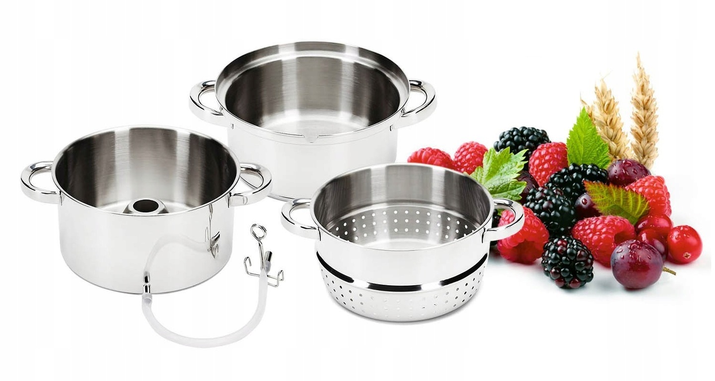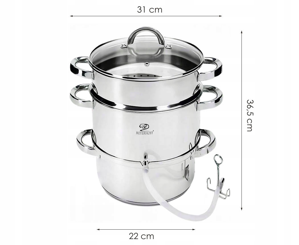 Соковижималка Meyerhoff виготовлена з нержавіючої сталі найвищої якості. Відповідна товщина стінокі багатошарове днодозволяють дуже швидко і рівномірно нагріватися соковижималці і підтримувати постійну температурувсередині. Завдяки цьому процес приготування соку триває від 30 хвилин до максимум 1 години - все залежить від твердості фруктів.