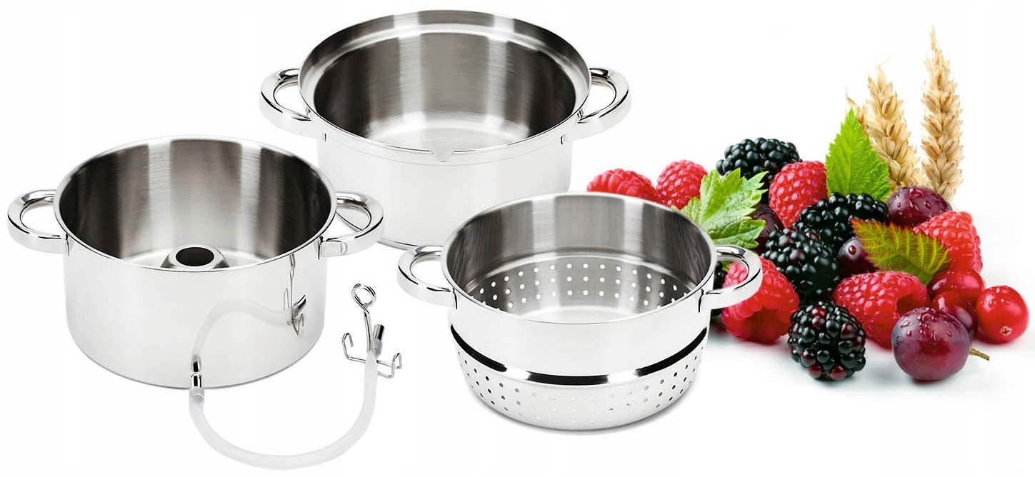 - Каструля для збору соку, загальна місткість: 8 л, довжина з ручками: 36 см, верхній діаметр: 27,5 см, нижній діаметр: 26 см, висота: 15 см