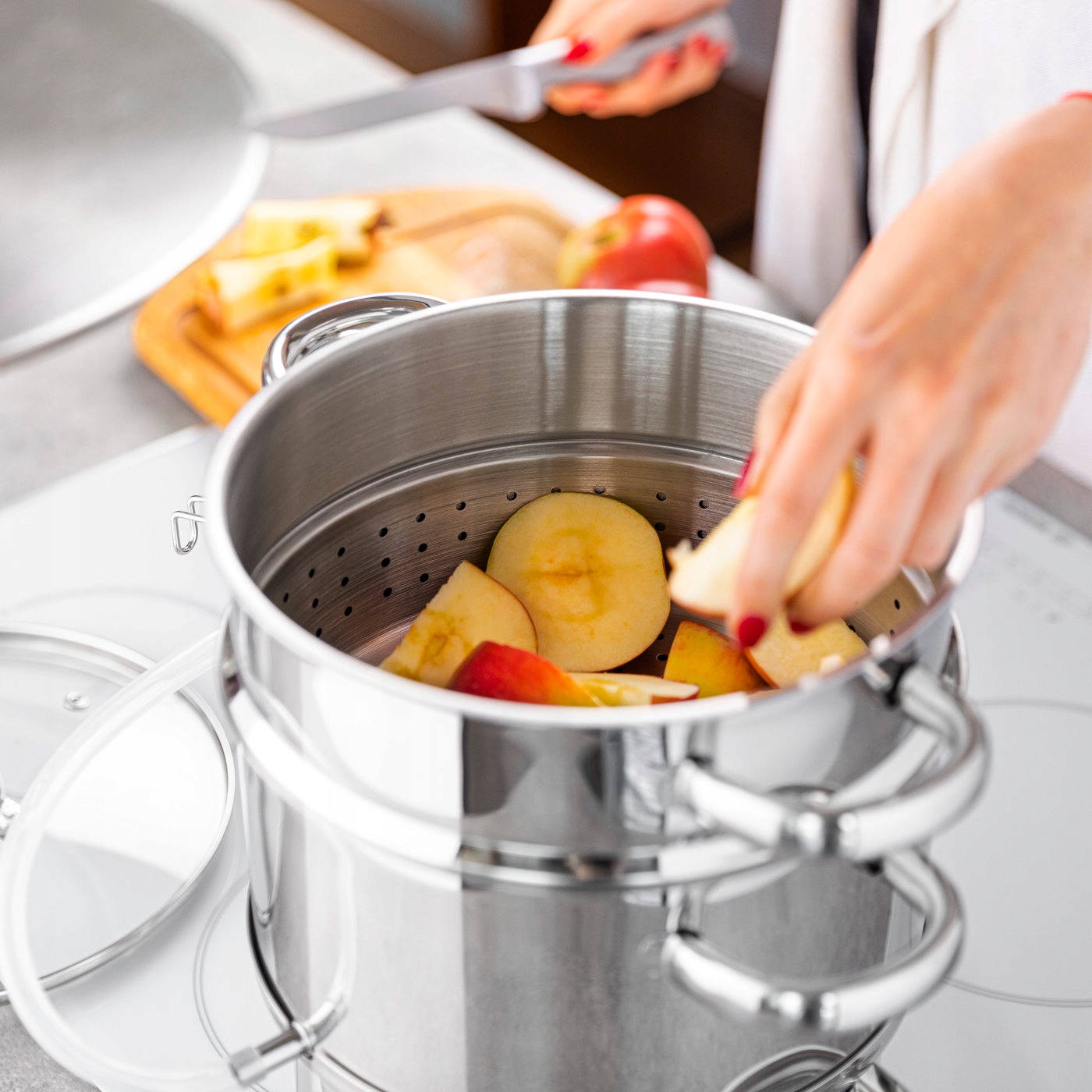 - Склад всього набору:a каструля для води, каструля для збору соку зі шланга, фруктівниця з кришкою, кришка із загартованого термостійкого скла з вентиляційним отвором