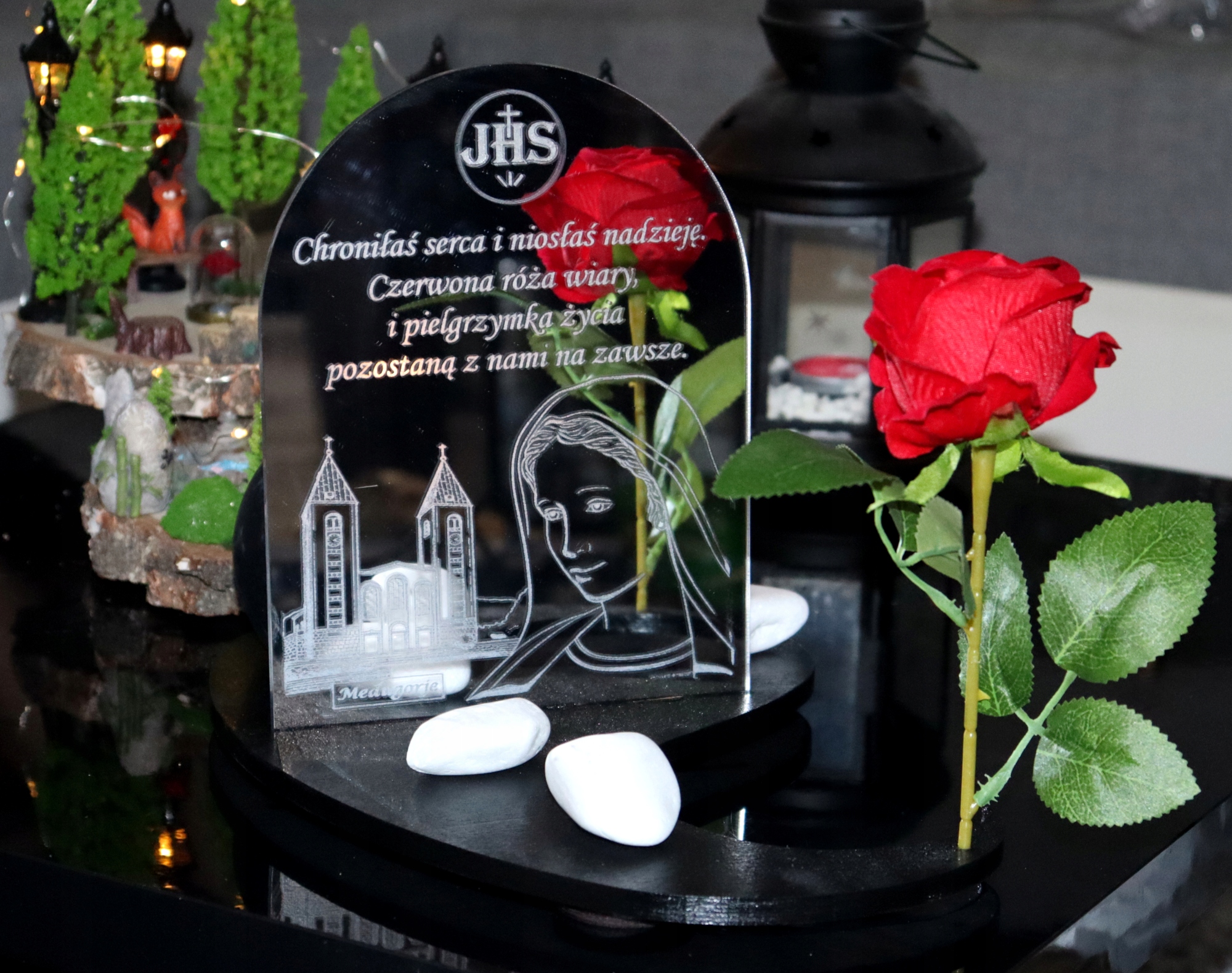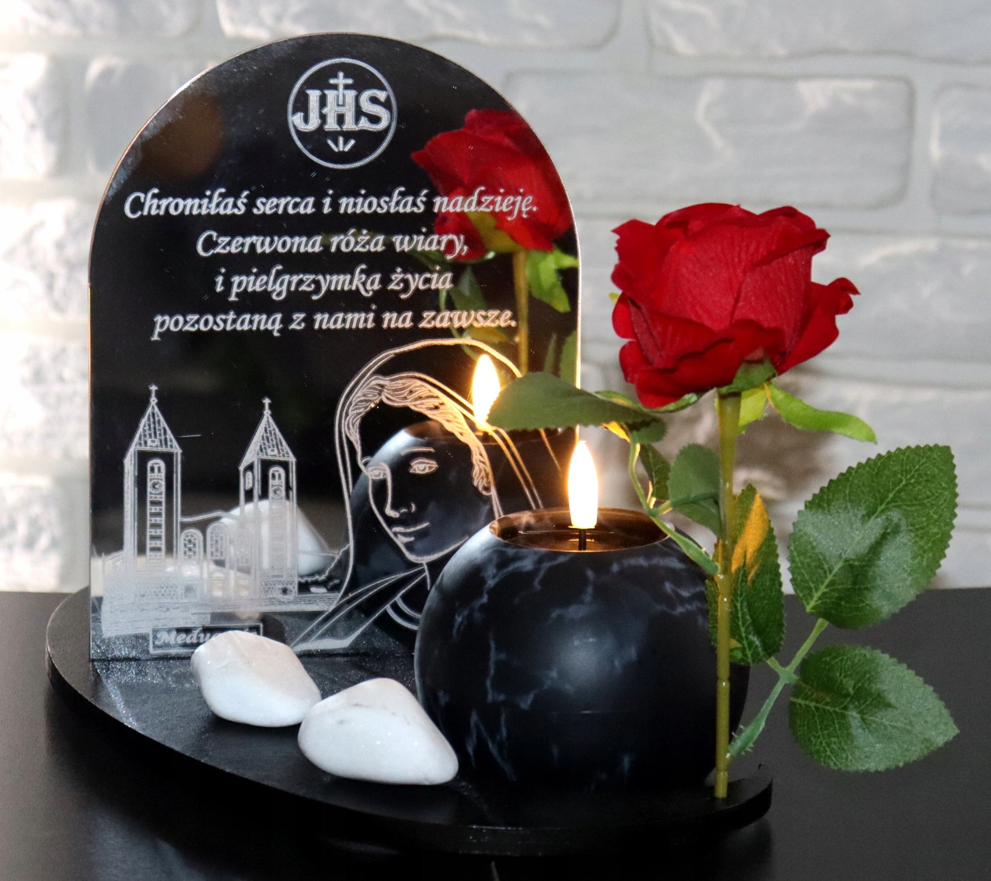 сонячна, традиційна або електрична свічка на могилі з елегантною підставкою для серця, яка ідеально поєднує функціональність з естетикою. Електрична та сонячна свічка оснащена акумуляторами та ніжним невеликим світлом у формі гніту або проводів, щоб після темряви він випромінював делікатне світло, створюючи атмосферу відбиття та пам'яті. Дзеркальна пластина, виготовлена з оргскла, на якій ми можемо вигравати будь -який вміст, що додає унікальний персонаж. Суцільна основа з фанерою берези, пофарбована в колір темної деревини. Червона, біла велюрова троянда або пластикова троянда також встановлена на підставці, що дає унікальність вибору, що завдяки його реалізму. Це ідеальний вибір для могили для коханої людини, яка, завдяки живленням акумулятора, є екологічним, і в той же час - прекрасний духовний сувенір. ul>
